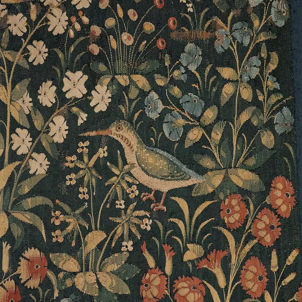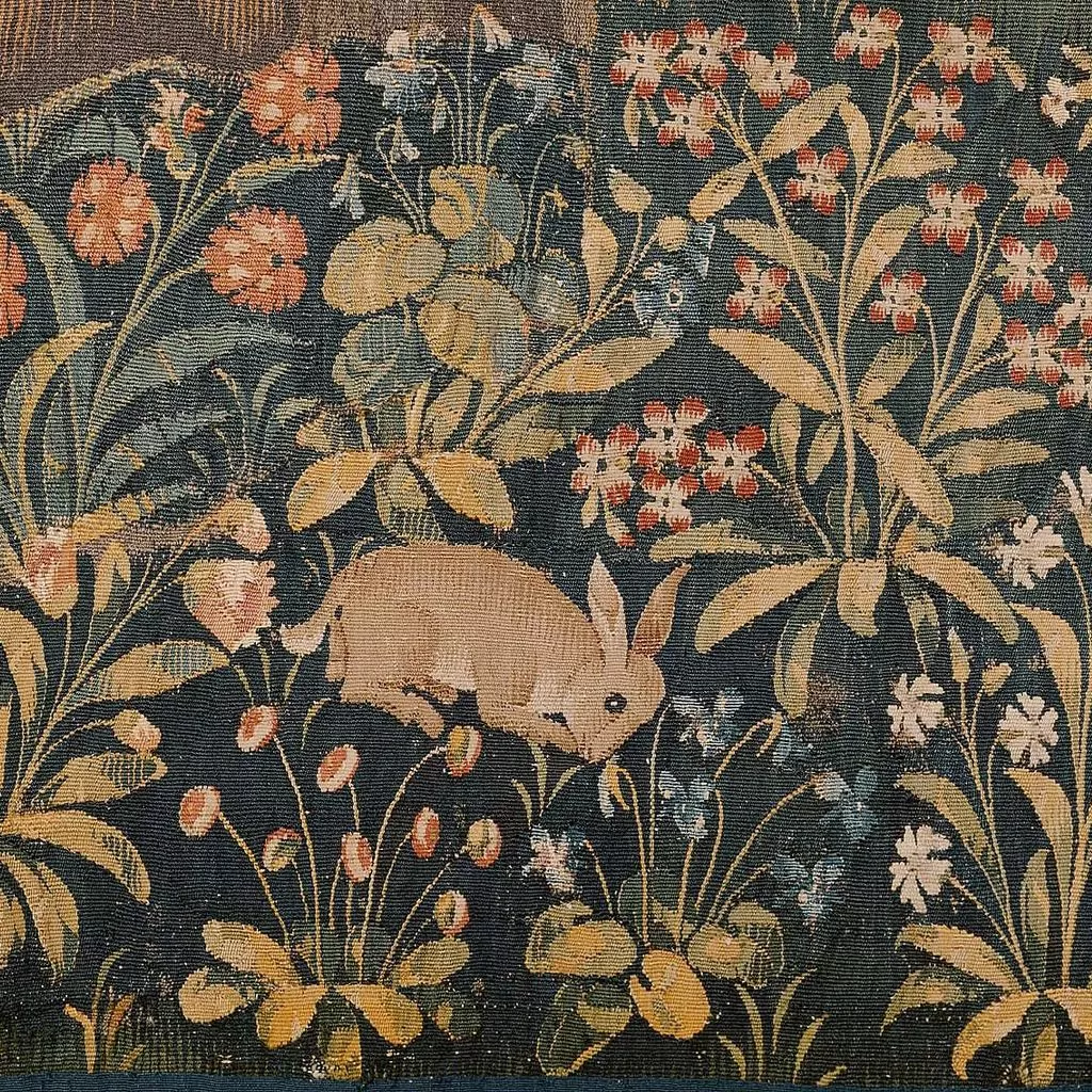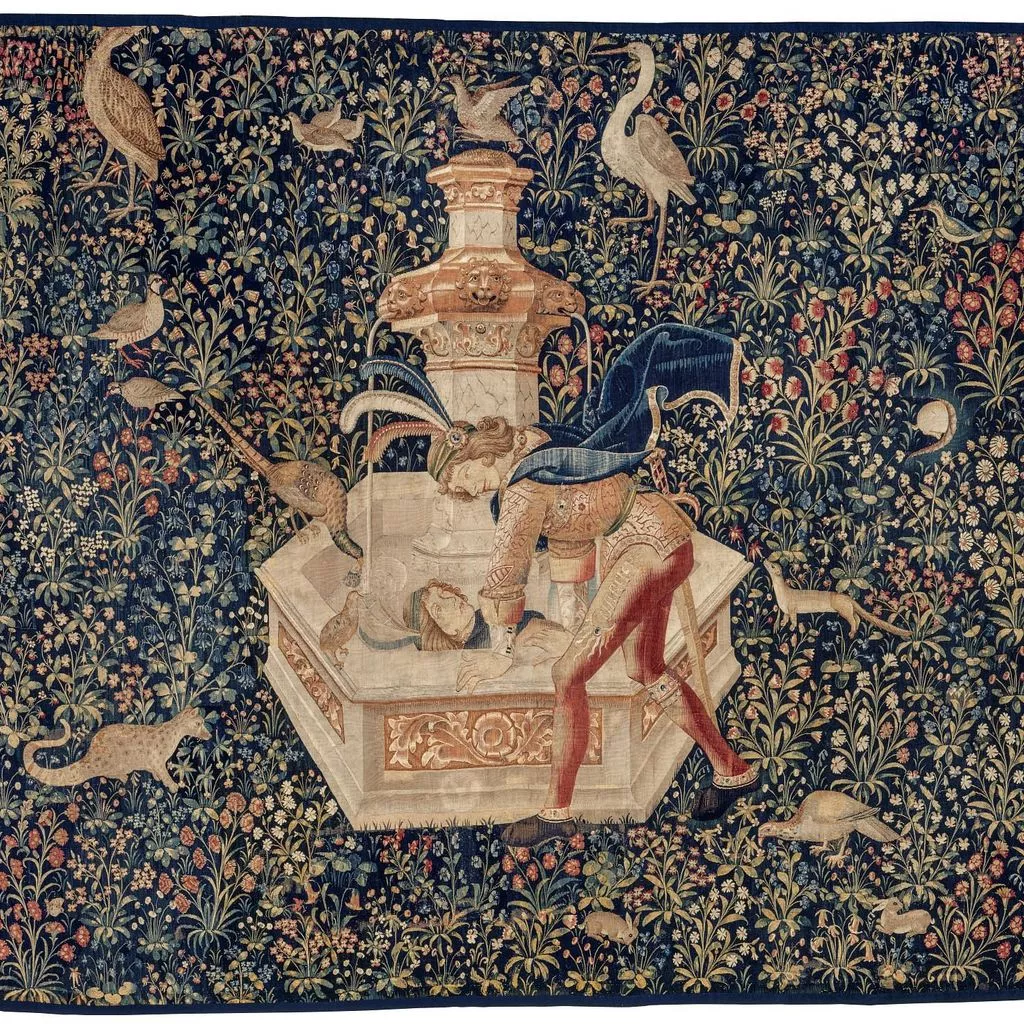 [3] See Ella S. Siple, "Art in America: French Gothic Tapestries of about 1500," The Burlington Magazine for Connoisseurs, Vol. 53, No 306 (Sept., 1928), pp. 145-146 where described as "a large millefleurs representing Narcissus at the well," "brought to America recently by Wildenstein and Company" (also pictured). Siple also affirms the provenance of Toulgoët-Treanna, writing "it is said to have been for many years in the possession of Monsieur de Talgonet at the Château de Rozay near Vierzon, some sixty miles from Tours."