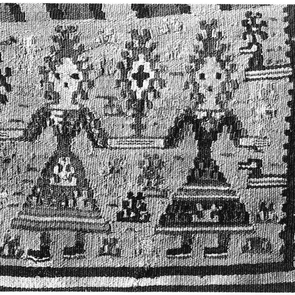 Warp: brown and white wool. 26 to decimetre. Weft: Yellow, pinkish red, black, and white wool, and a little blue cotton. Design: through middle are zig-zag lines of yellow, pink, and black. Above and below, bands of geometric ornament including rows of angular ladies.