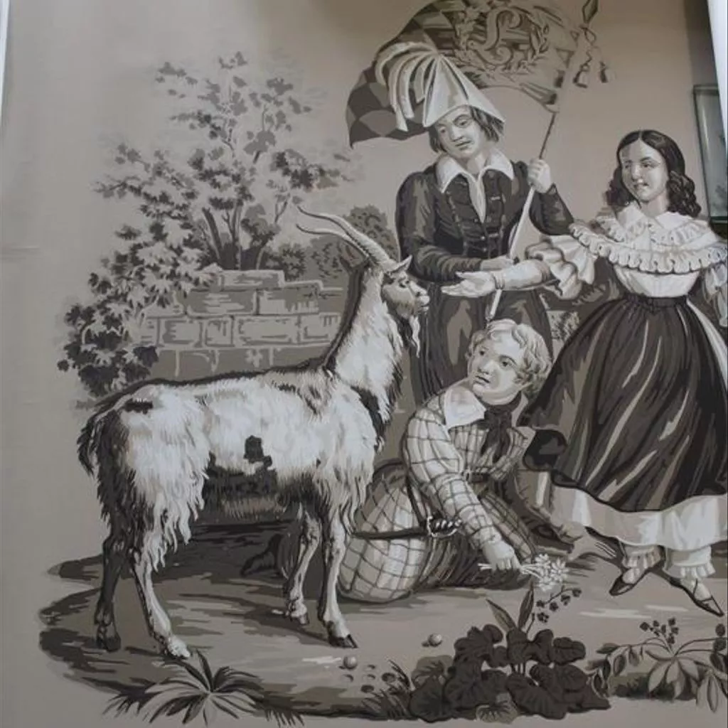 One of a pair of supraportes in brown and white on a buff ground. The scene shows a boy with a banner (Ludwig I of Bavaria), a girl (Lola Montez) holding a doll (the Queen of Bavaria), and a kneeling boy (Lola Montez’s father); Silk-screen print, on paper. One of a pair of supraportes in brown and white on a buff ground. The scene shows a boy with a banner (Ludwig I of Bavaria), a girl (Lola Montez) holding a doll (the Queen of Bavaria), and a kneeling boy (Lola Montez’s father); Silk-screen print, on paper; After drawings by Frau Sattler; Produced by Wilhelm Sattler of Schweinfurt-am-Main; Reproduction from the original by Kurt Weber, Dreye bei Bremen; ca.1840-48. A disguised political theme is contained in the picture, which shows a boy with a banner (Ludwig I of Bavaria), a girl (his mistress Lola Montez) holding a doll (the Queen of Bavaria), and a kneeling boy (Lola Montez's father).