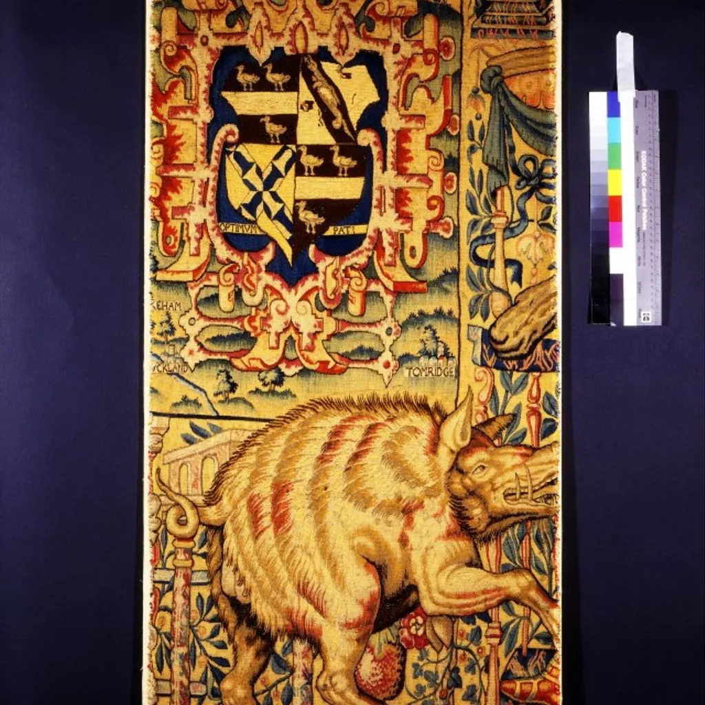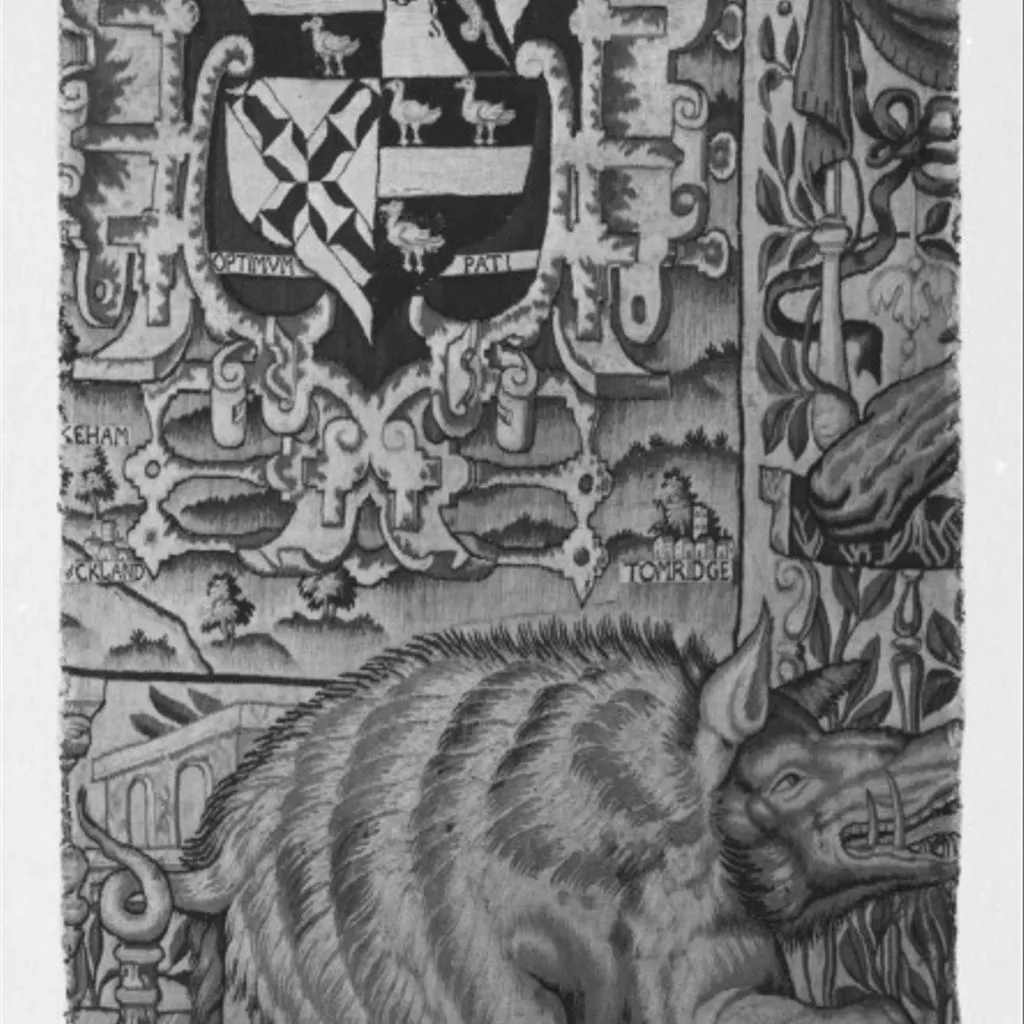 Tapestry fragment woven in wool and silk. 16-17 warp threads per in (6-7 per cm). Part of the lower right hand edge of the tapestry map of Oxford and Berkshire, and showing the coat of arms of Ralph Sheldon Senior (1537-1613), and the family motto 'OPTIMUM PATI'. In the border is a wild boar and the tip of Hercules' club which is visible in the right border.