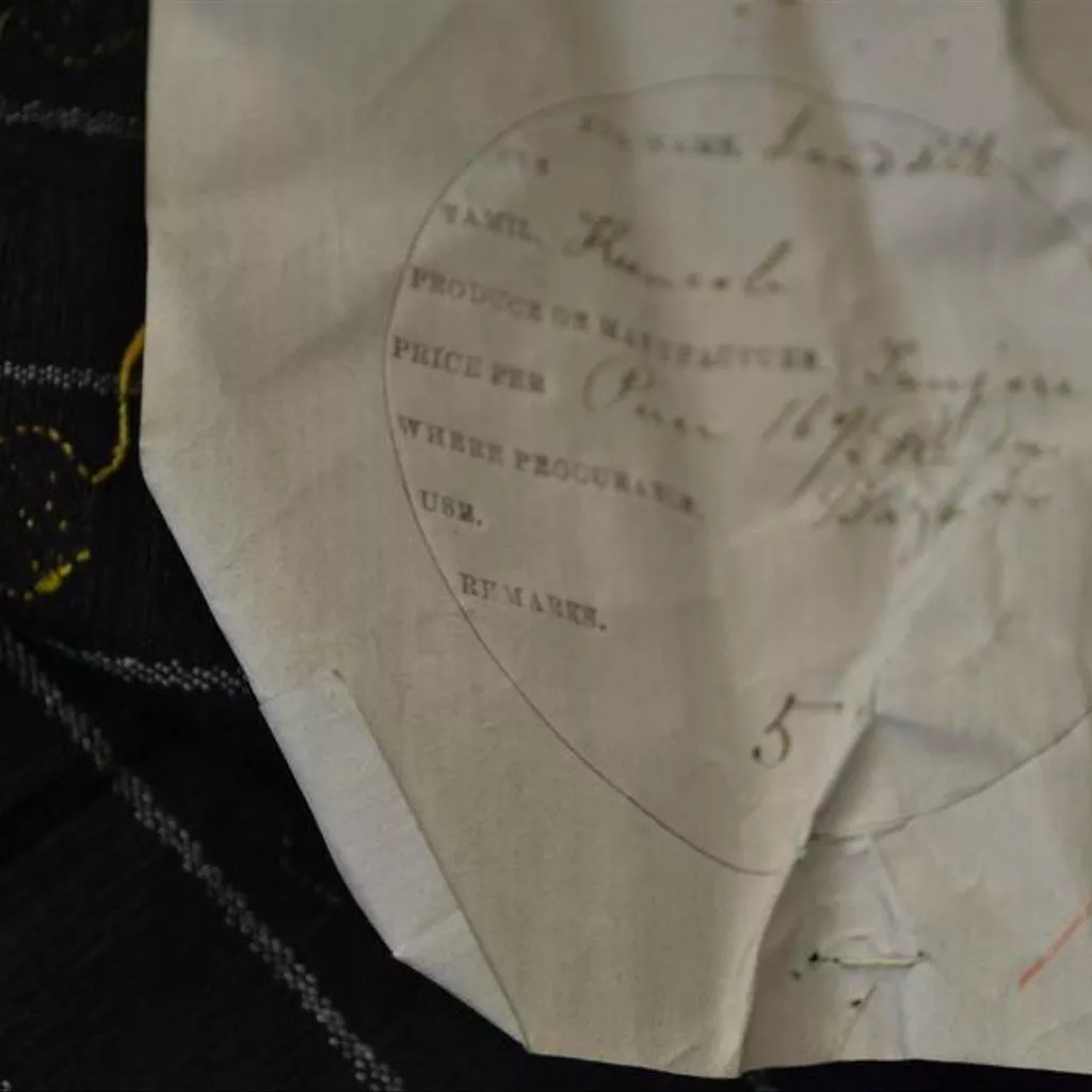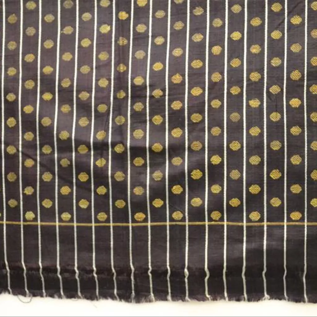 The complete piece would have been intended for use as a garment, clothing. One end of a length of purple mashru, with white vertical stripes and staggered circular motifs in gold-wrapped thread. Red selvedges. Textiles, part of a length of mashru, Thanjavur, ca. 1855.