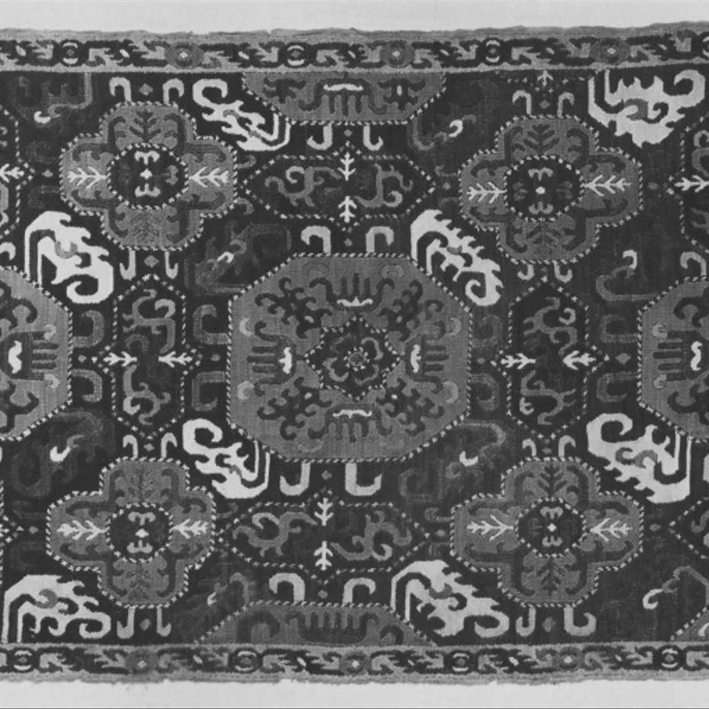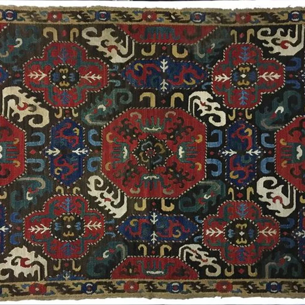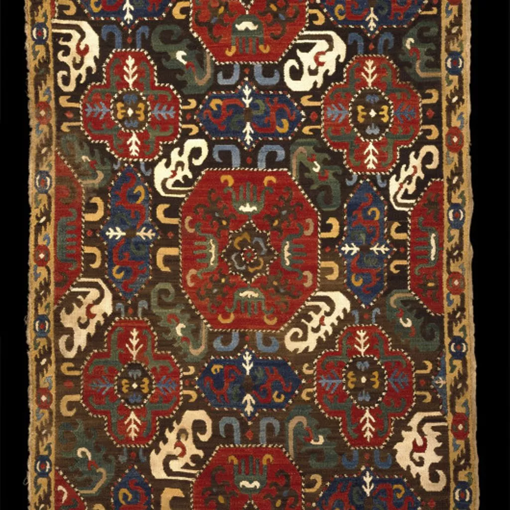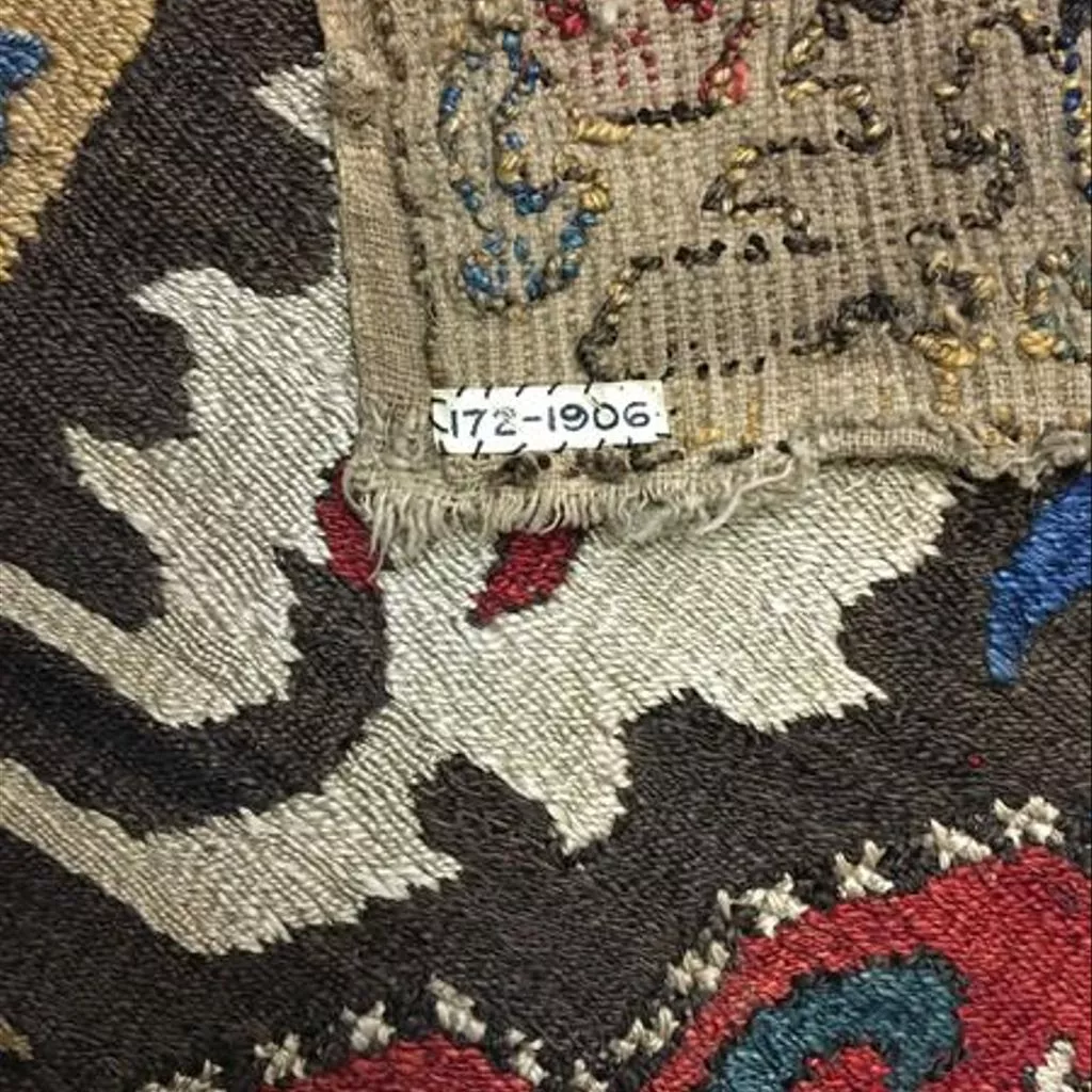 Two pieces of fabric have been sewn together before being embroidered. A dark brown ground with a central octagon is surrounded by four blue ground elongated hexagons and four red ground lobed medallions. Blue and yellow curved hooks come from the octagons, as do green or white curled leaves. Blue and yellow curved hooks come from the lobed medallions. The octagons contain a green and yellow 'five-fingered' motif, which may simply be a leaf or may be a version of 'the hand of Fatima' motif. The motifs are outlined with a border of brown and white or red, brown and white cross stitch. There are mistakes in the design: the octagon at the centre bottom has two sides parallel instead of converging and the octagon at the top has two sides going out instead of converging. In the lower left hand corner the blue hexagon is vertical instead of horizontal.