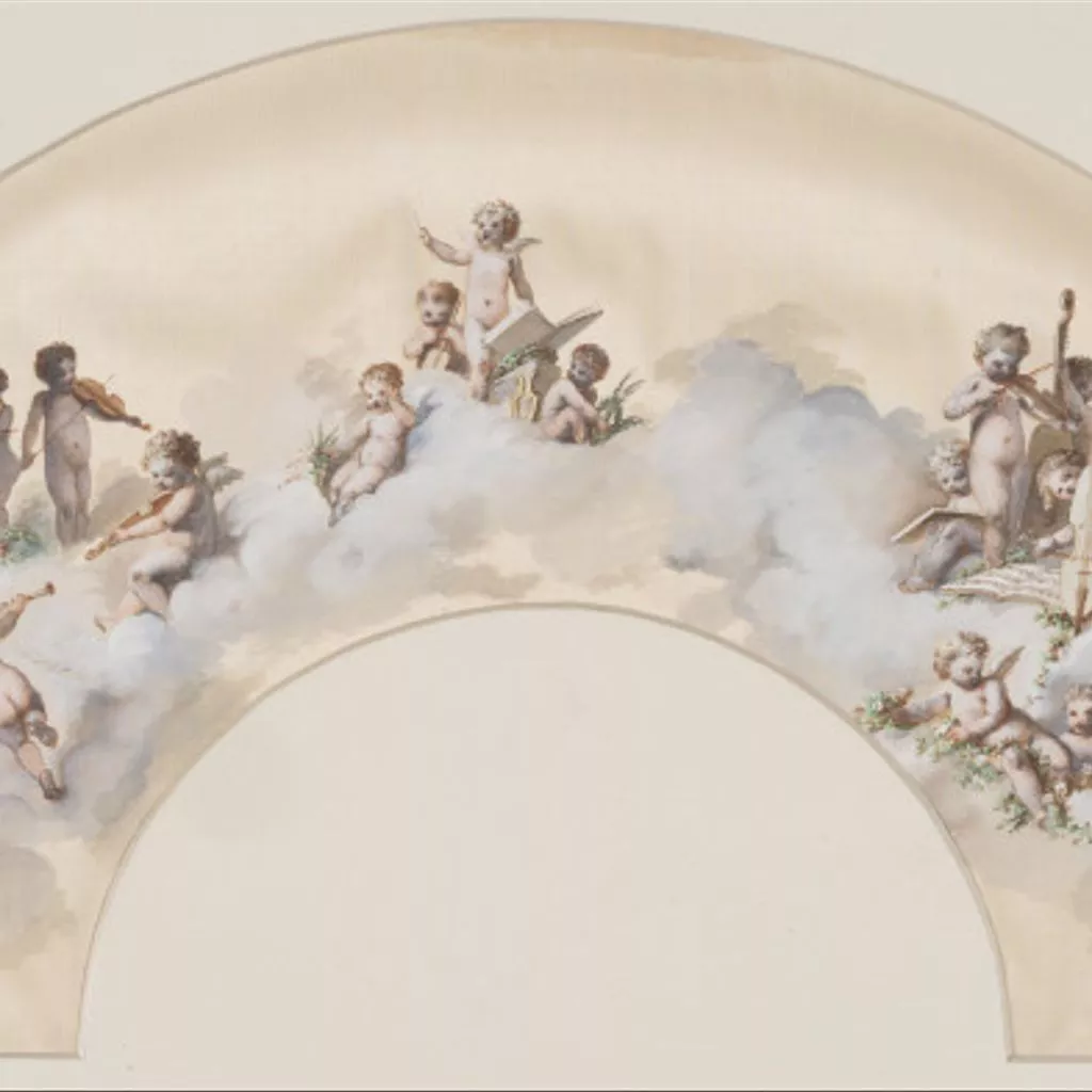 Watercolour on silk design for a fan depicting a concert of cupids, by Mme. Josephine Calamatta (nee Rochette), possibly after Cronn. French School, ca. mid 19th century.