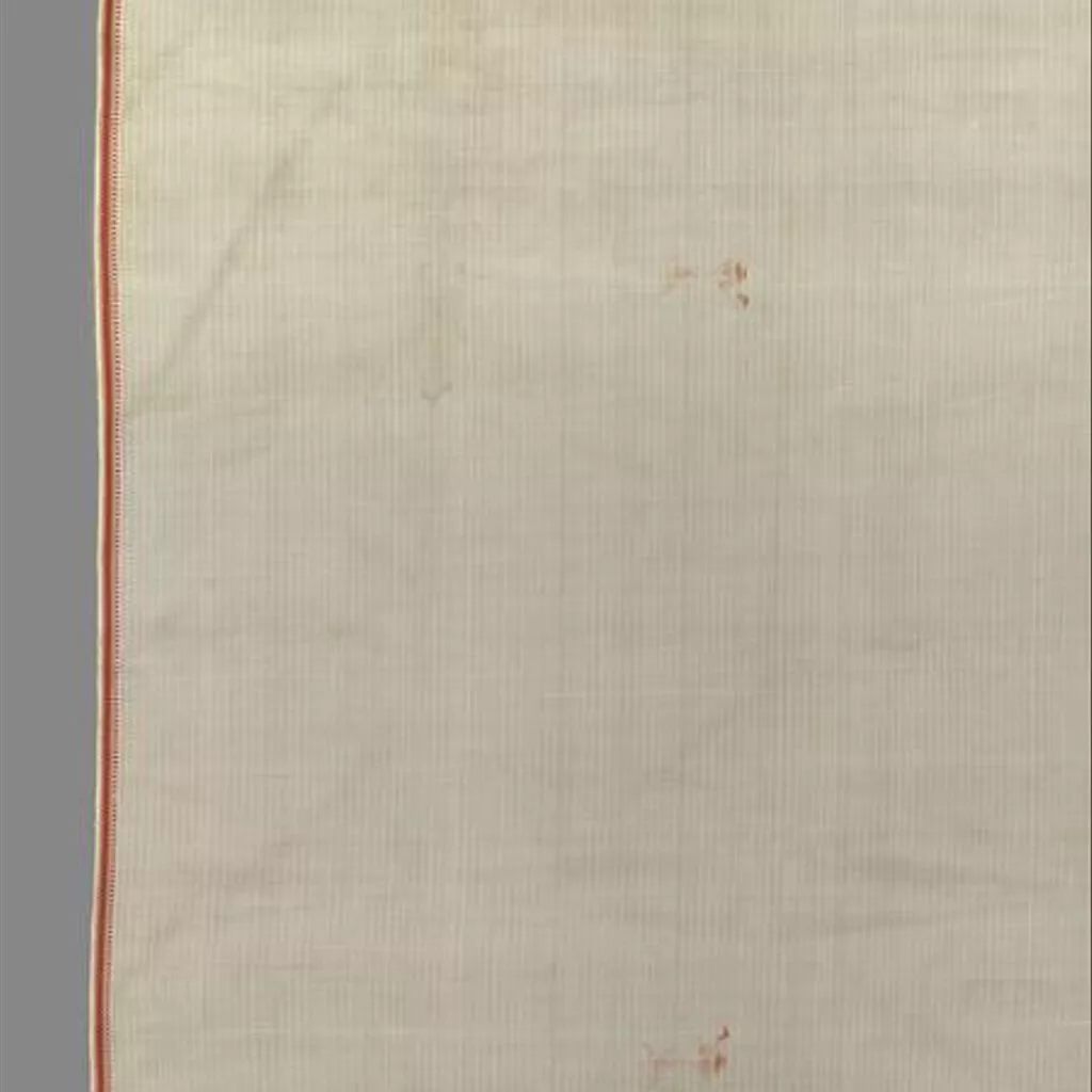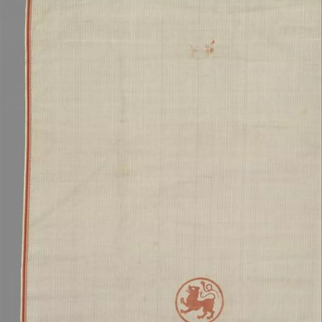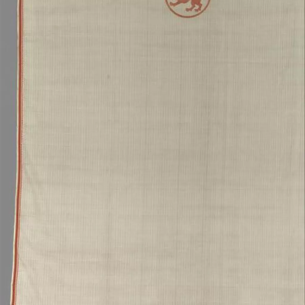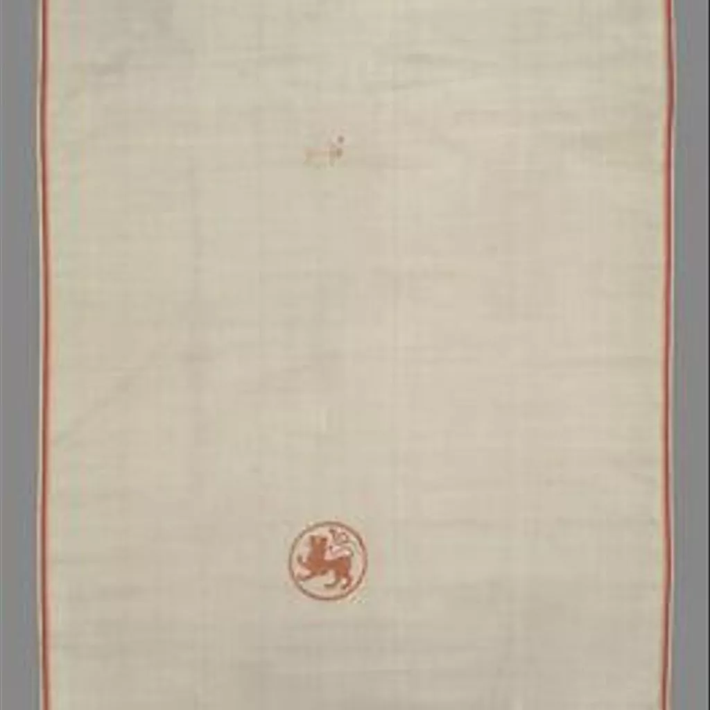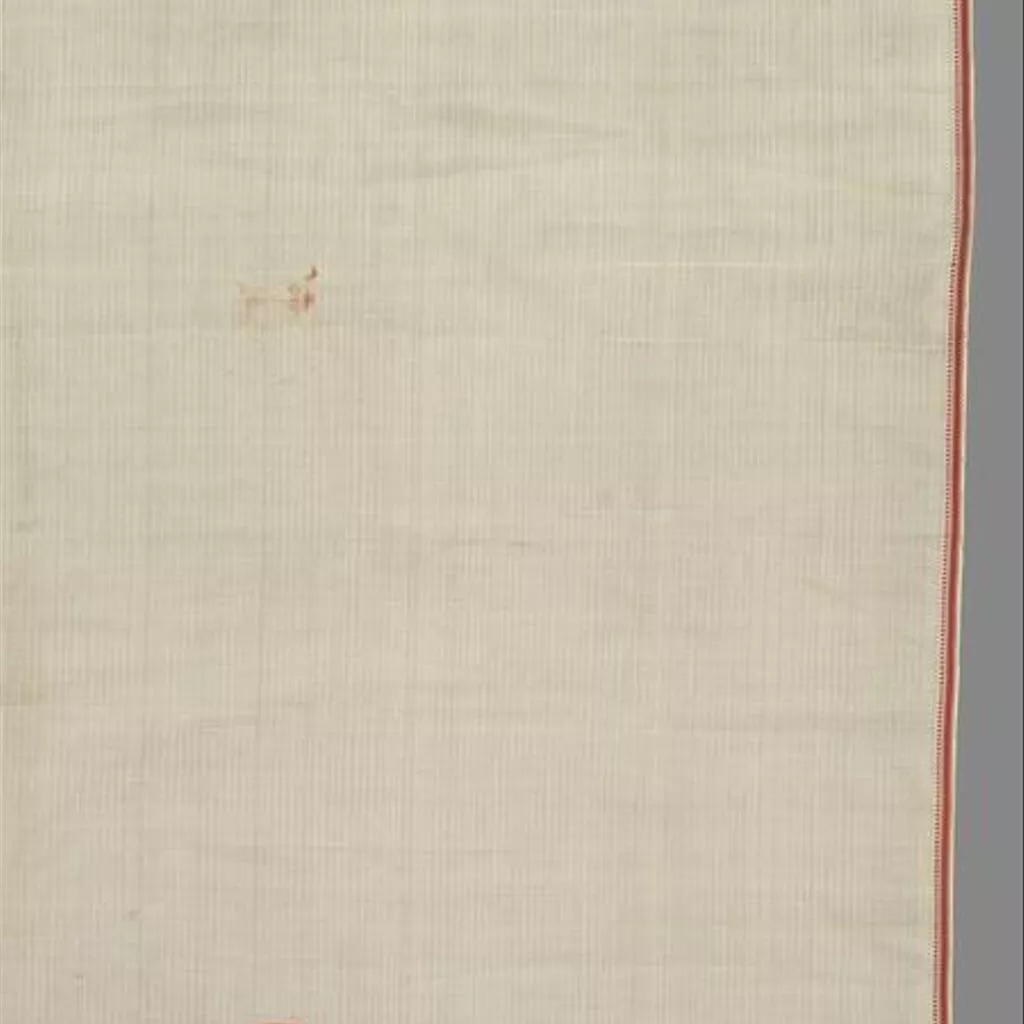 Intended for use as a garment, clothing. Complete wrapped garment for a man, white cotton field with self checked weave, narrow side borders of red, green, yellow and white silk, end borders with horizontal bands of red silk. A circular red stamp featuring a lion and snake in the field. Textile, man's wrapped garment, cotton with coloured silk borders, Chanderi, ca. 1867.