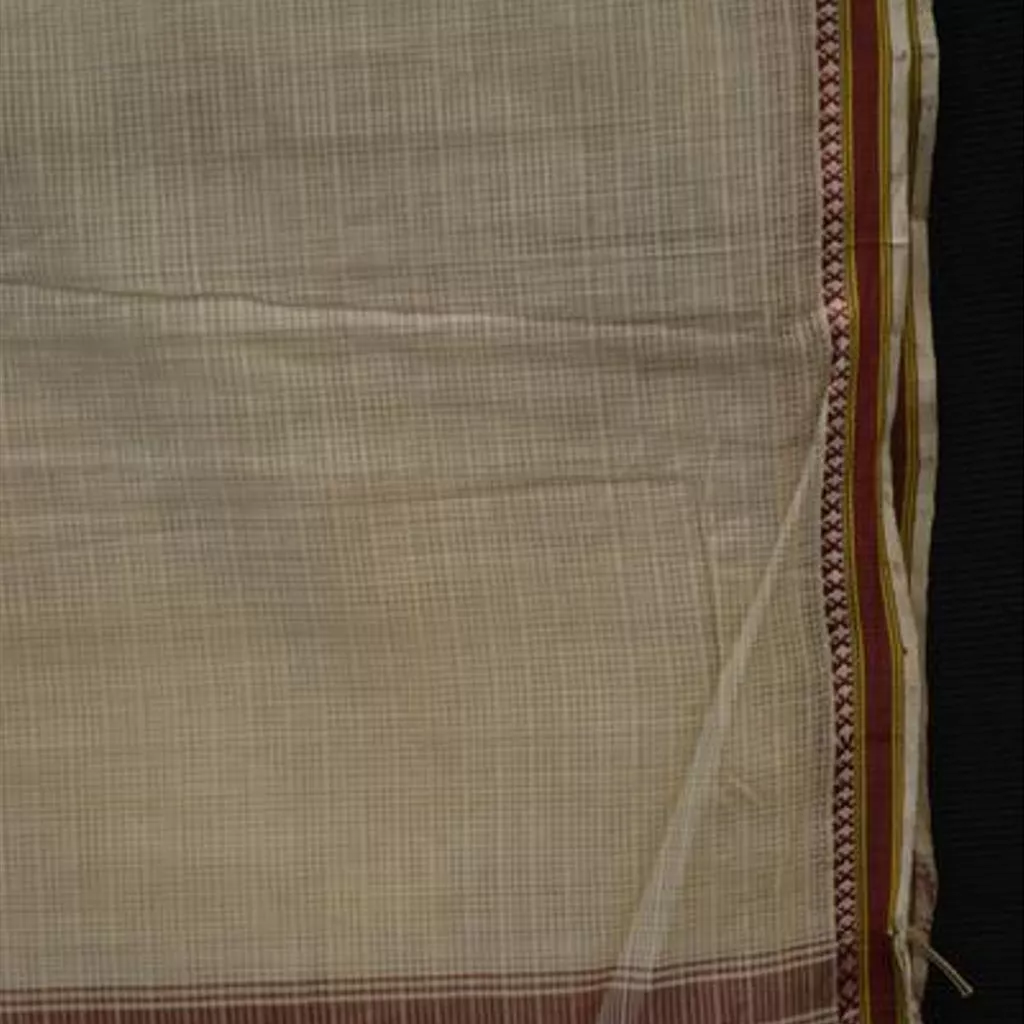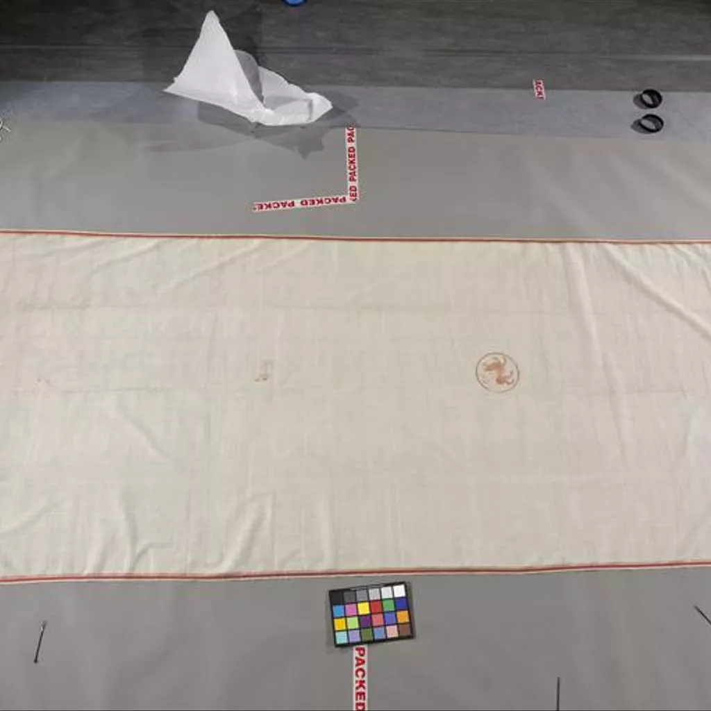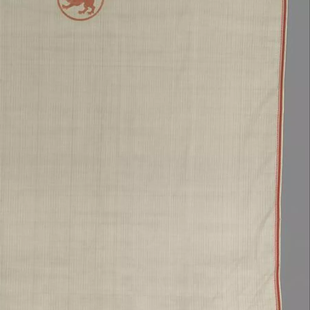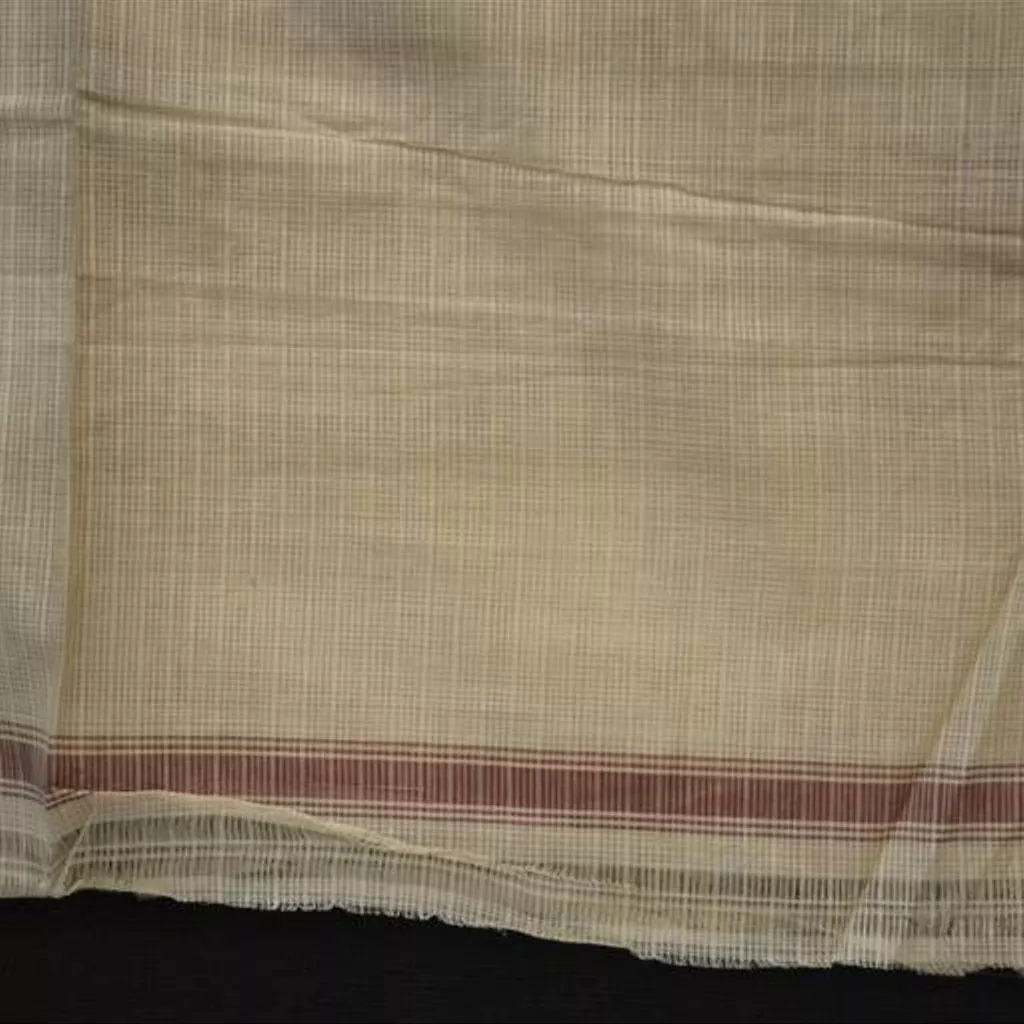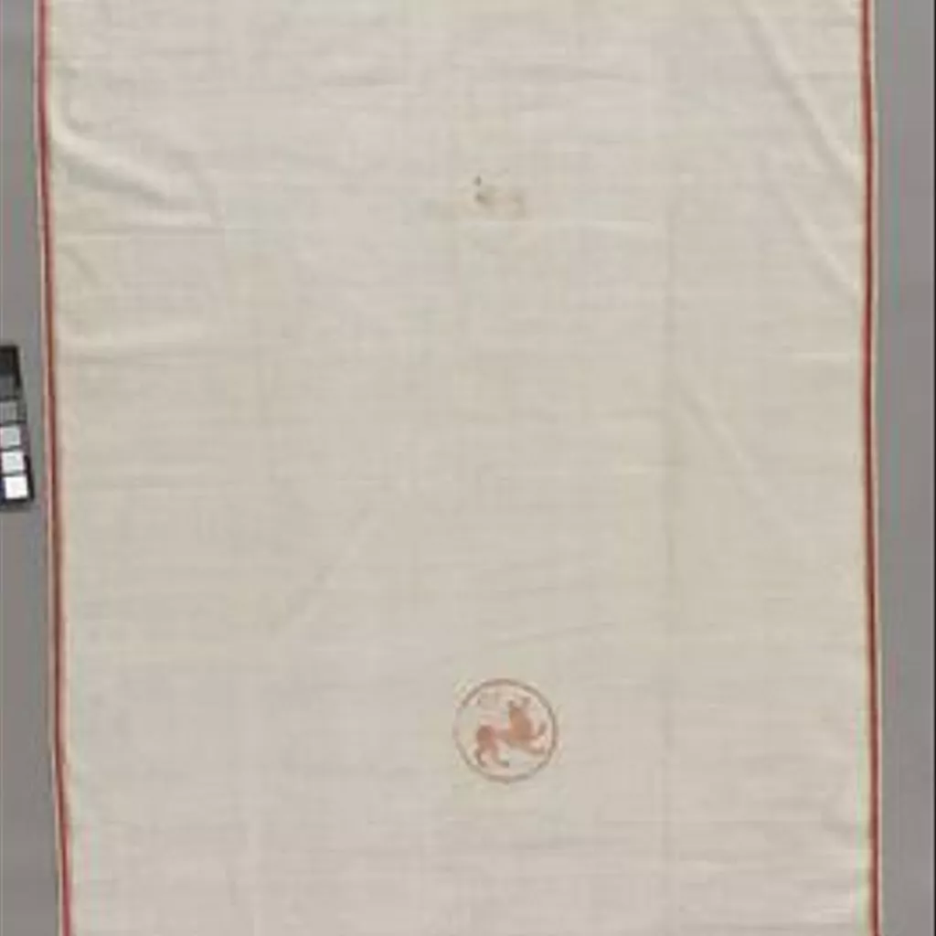 Intended for use as a garment, clothing. Complete wrapped garment for a man, white cotton field with self checked weave, narrow side borders of red, green, yellow and white silk, end borders with horizontal bands of red silk. A circular red stamp featuring a lion and snake in the field. Textile, man's wrapped garment, cotton with coloured silk borders, Chanderi, ca. 1867.