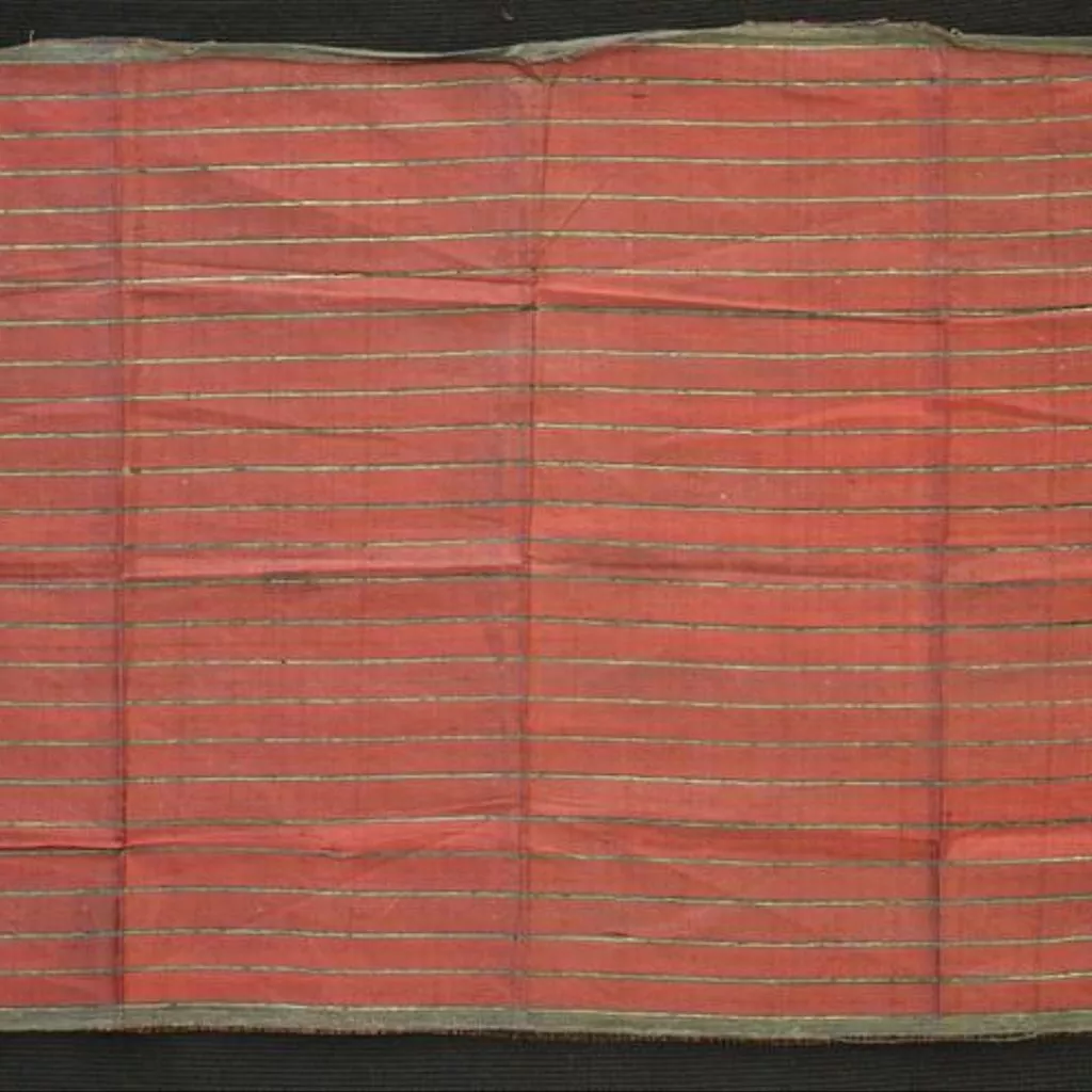 Intended for use as a garment, clothing. Piece of silk, with transparent horizontal stripes in red and green with silver-wrapped thread running through them. Textile, striped silk garment piece, Thanjavur, ca. 1855-1879.