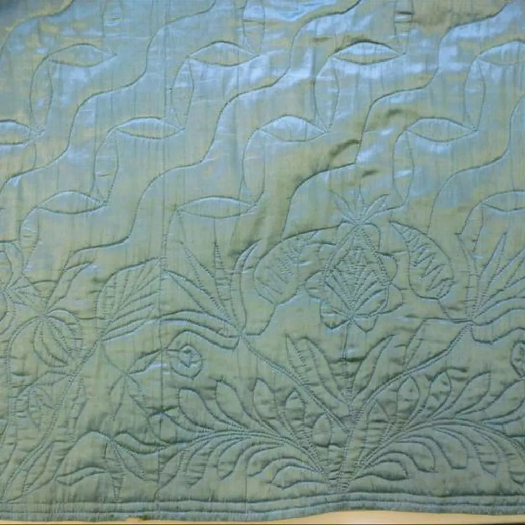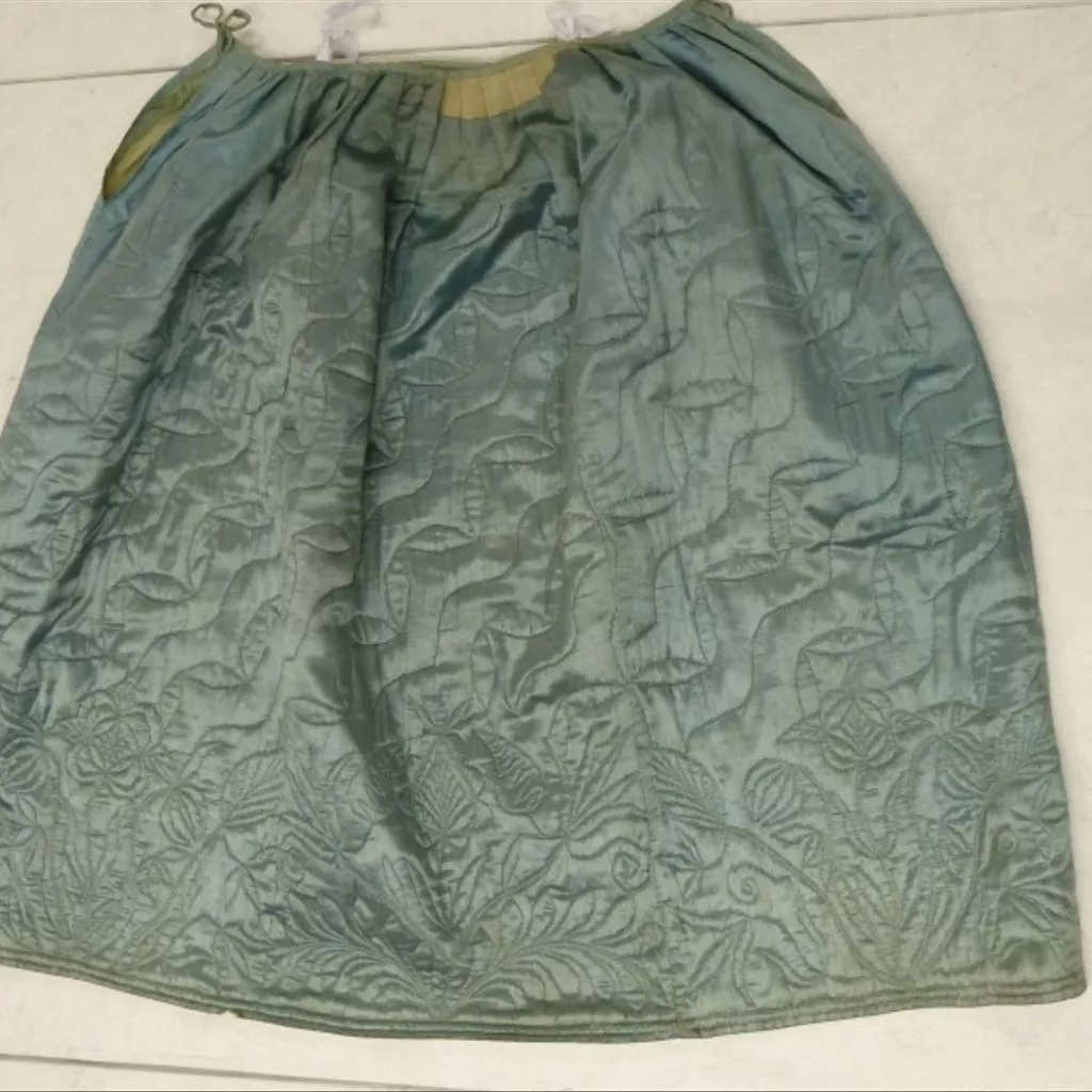 Woman's petticoat made of light blue silk satin lined with glazed undyed wool and wadded with a thin layer of wool. It is quilted in running stitch with light blue silk thread in a border of flowers and leaves at the hem and undulating parallel diagonal lines above. The petticoat is made of 6 panels of silk, with pocket openings in the side seams. There is a wide box pleat, with side pleats, at the centre front, and an inverted box pleat, with side pleats at centre back. The waist is bound with a ⅞-inch (2.2 cm) wide blue linen tape, extending to form the ties on each side. Woman's petticoat, 1750-70, British; Pale blue silk satin, quilted with a floral border