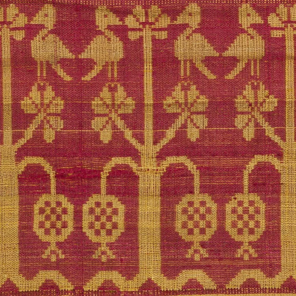 Sobre un fons de color vermell destaquen motius geomètrics, estrelles, flors de vuit pètals i ocells encarats a banda i banda d’un arbre de la vida amb magranes.