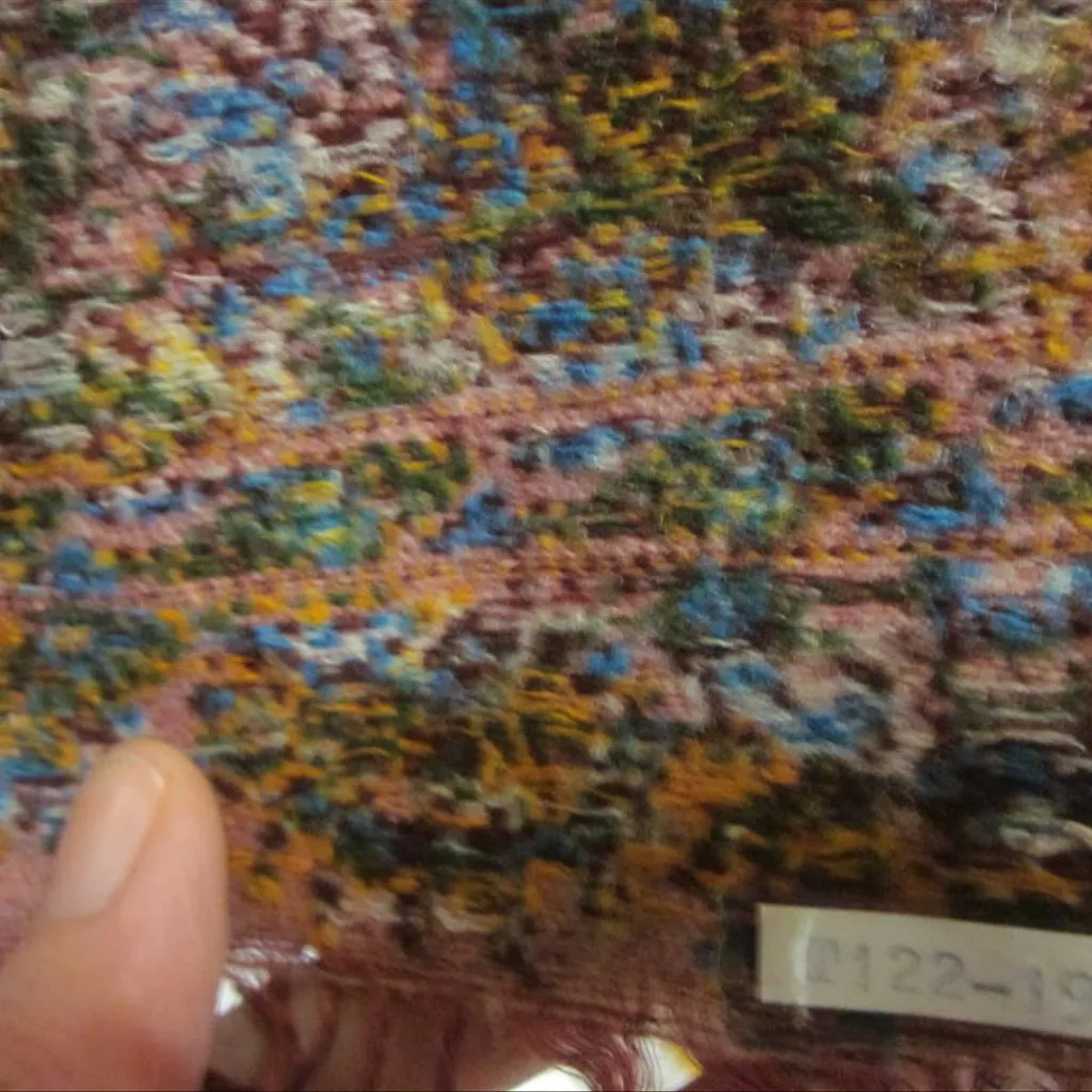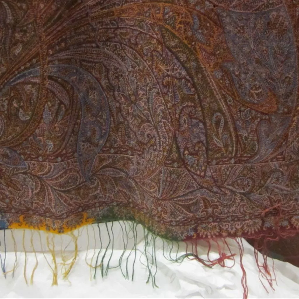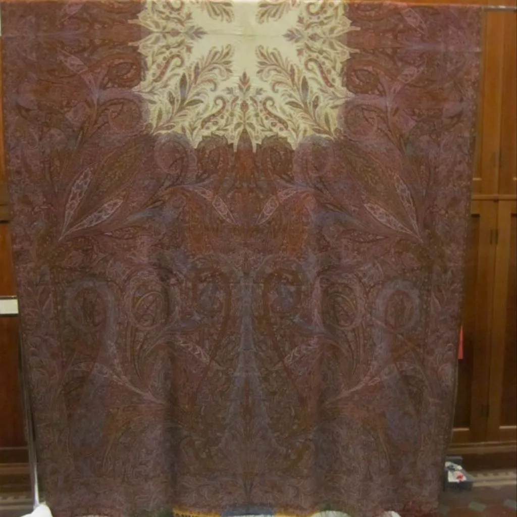 Shawl of wool and silk, made in Paisley, Glasgow, 1845-1849 Shawl with deep borders of heavy pattern encroach upon a plain white centre which is invaded by delicate fronds bearing fern-like cones. The border design is an intricate interlacing of leaf-like cones. The shawl is woven with woollen wefts on a printed silk warp which is white in the centre, deep pink for the borders, and pink, green, yellow and blue for the coloured end-pieces and twisted silk warp fringe. The plain centre of the shawl is in a fine twill. The pattern is bound in a fairly coarse twill. The shawl's selvedges are woven with emerald green silk in a satin weave.