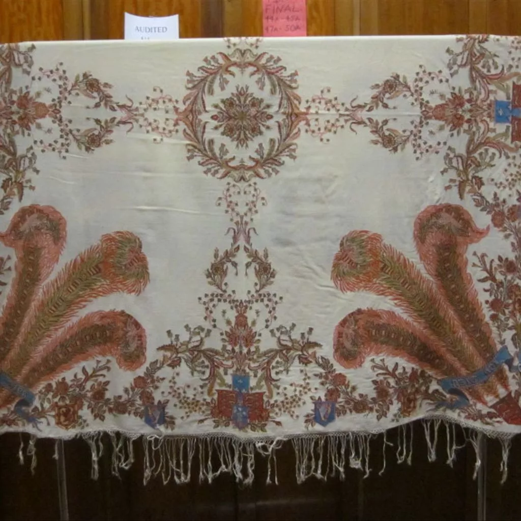 Woven shawl with the insignia of the Prince of Wales. In the four corners are three Prince of Wales's feathers linked by the motto 'ICH DIEN' rising from a small shield with the leopards of England to dominate each quarter. The feathers are broad, brightly banded lines, with an inner growth of green, yellow and brown and an outer growth of red and yellow. A meander of roses, thistles and a little shamrock, with small shields superimposed bear the arms of Scotland and Ireland form a free border to link the corner designs with the central feature of each side, where there are four shields, with the arms of France, the Prince of Wales's feathers and two sets of the Leopards of England (which because of the point repeat are shown in opposite directions) over a symmetrical arrangement of delicate sprays bearing more roses, thistles and shamrocks which reach in towards a central wreath of thistles around a rosette of roses and rose buds.