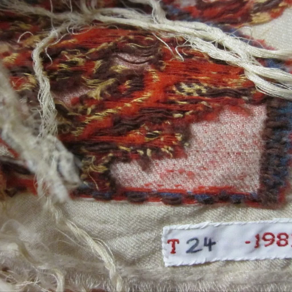 All this is woven in bright red, bright mid-blue, dull yellow, pale yellow-green and very dark brown wool with pale yellow silk on a creamy-white ground bound in twills. At the top and bottom is a narrow fancy edging in white before the silk warp forms a lattice fringe with three rows of knots. A smaller fringe is knotted into the selvedges.