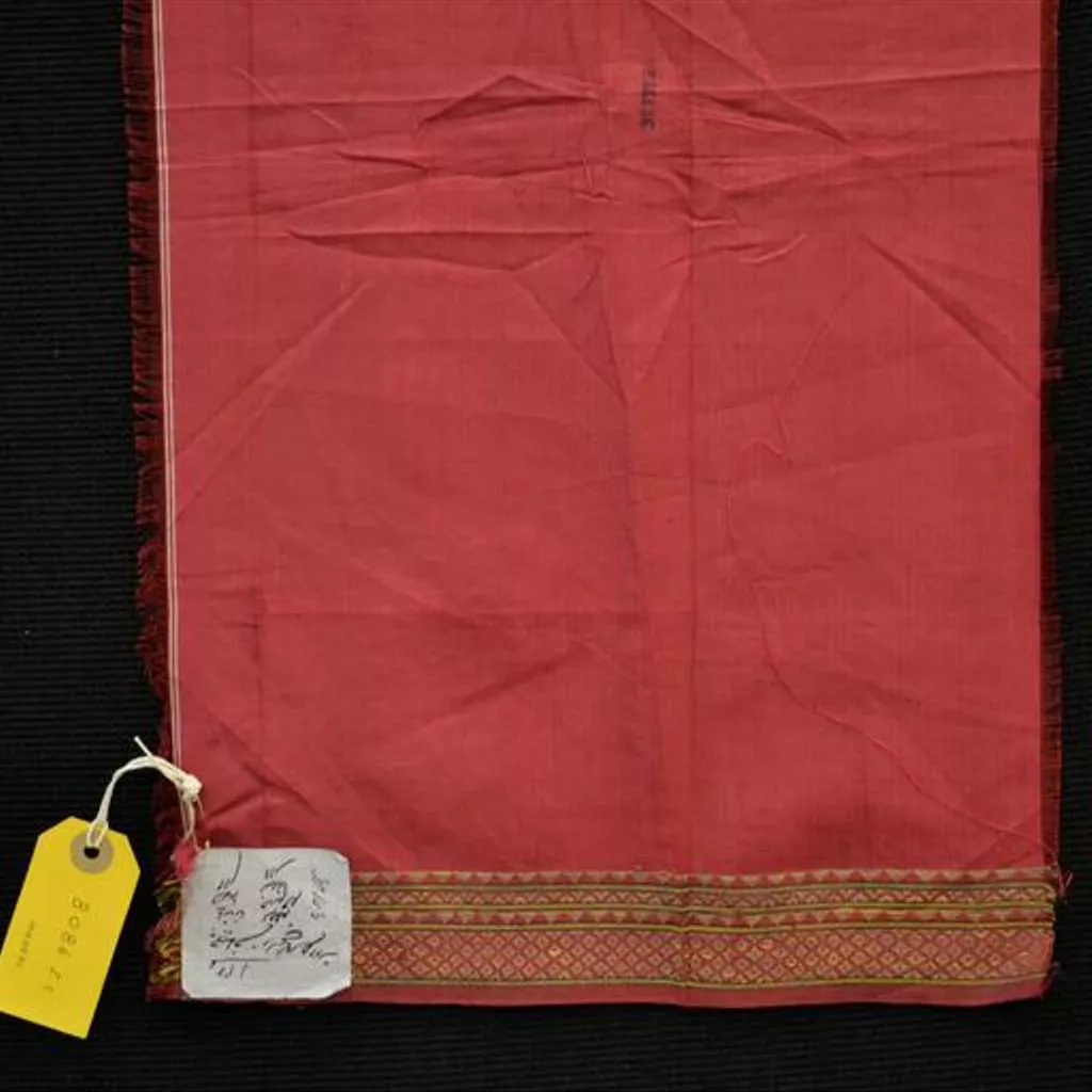 The complete object would have been intended for use as a garment, clothing. Fragment of red silk, with border of gold-wrapped thread. Textiles, red silk fragment, Madras, ca. 1855-1879.