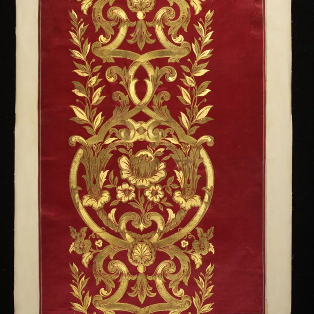 Wall hanging, crimson with a gold print; Woodblock print on silk; Stamped with manufacturer's name and Exposition Universale, Paris 1855. Wall hanging, crimson with a gold print; Woodblock print on silk; Stamped with manufacturer's name and Exposition Universale, Paris 1855; Produced by Santesson et Cie, Paris, for the Paris Universal Exhibition; French; ca. 1855.