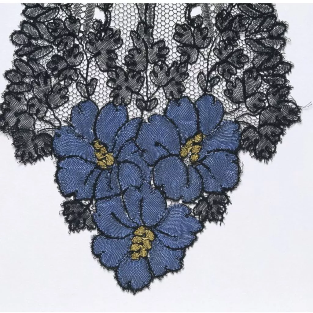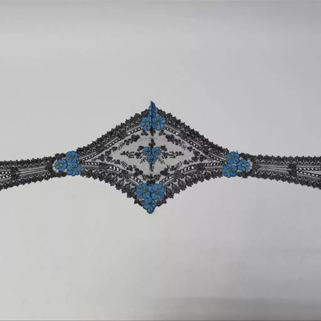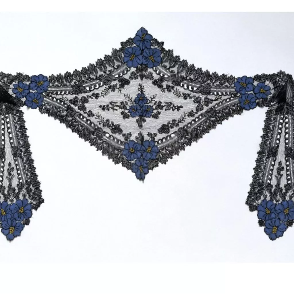 Silk bobbin lace flat cap, possibly made in Caen, France, ca. 1860 The French town of Caen specialised in coloured silk lace. This cap with lappets may have been made there. Its combination of black and coloured lace is typical of handmade and machine-made laces in the 1850s and 1860s. Black lace became very fashionable from about the 1850s. The trend was reinforced by the Empress Eugénie of France, who loved wearing lace and particularly favoured black. Black silk bobbin lace was a major part of production in northern France and an important industry in Spain. The machine-made lace industry also developed to meet demand. Much of the machine lace that survives from the 19th century is black in imitation of French hand-made bobbin lace. Some of it is of very high quality and design. Bobbin lace flat cap. Made in one piece with long lappets falling on either side of the diamond-shaped headpiece. Bobbin lace in the Chantilly technique worked with black grenadine silk in twist net, half and honeycomb stitches. Clusters of flower-heads on the crown of the headpiece and at the centres and ends of the lappets are worked in dense clothstitch in bright blue silk with yellow centres.