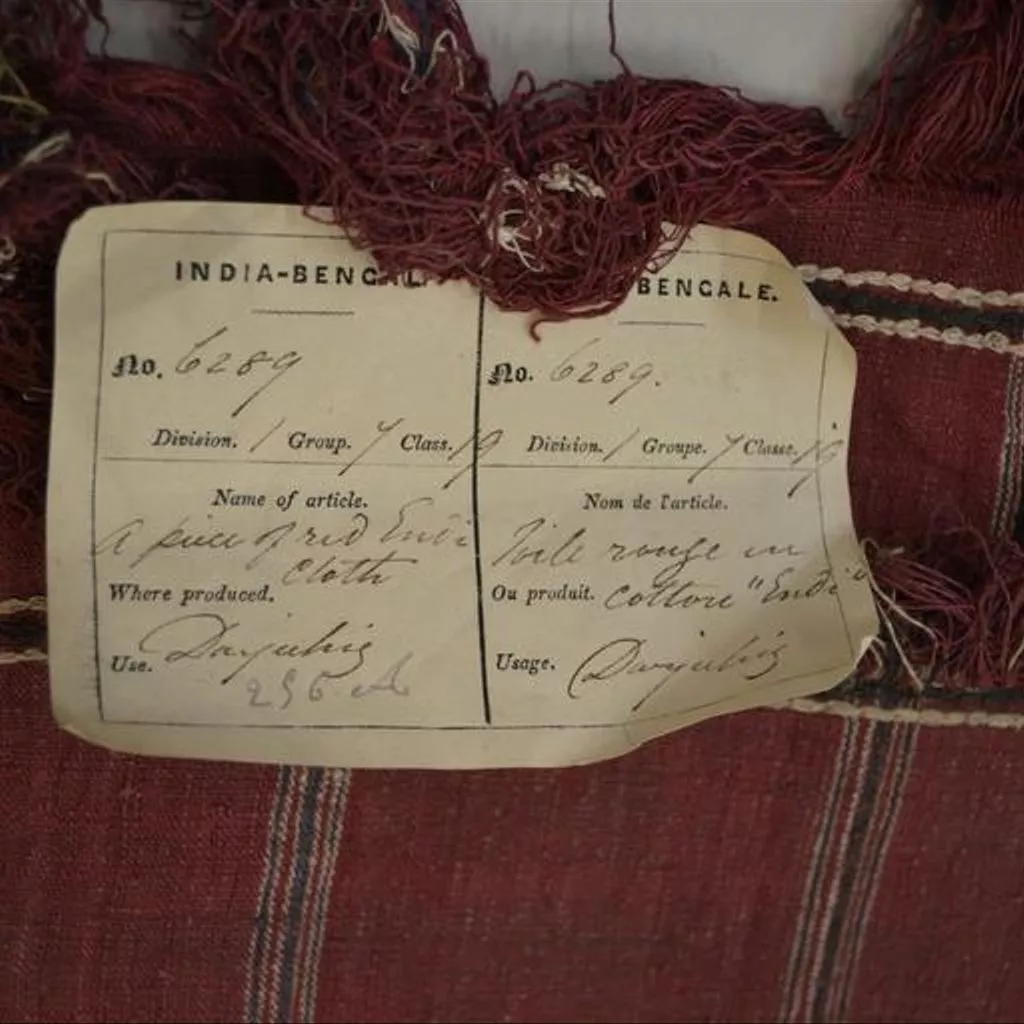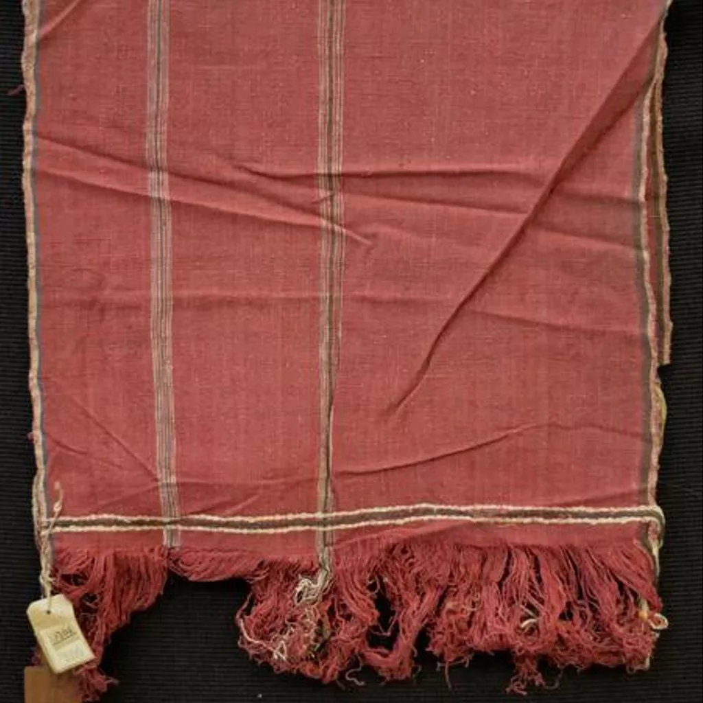 Intended for use as a garment, clothing. Complete sash, red dyed eri silk with narrow white and grey stripes. Fringes at both ends. Textile, sash, eri silk, Darjeeling, ca. 1855.