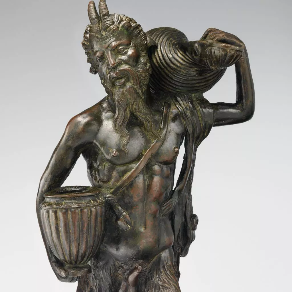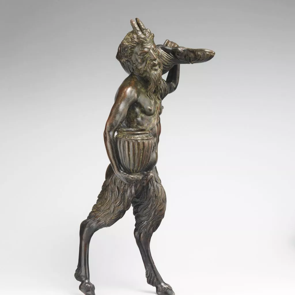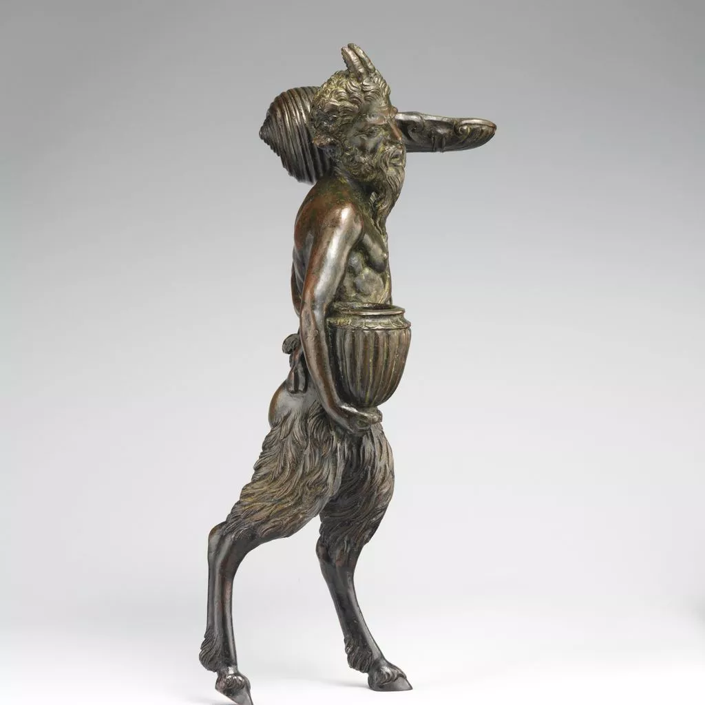 In the half-human, half-animal features of the mythical race of satyrs, Andrea Briosco, called Riccio, found great expressive potential. Furthermore, the creatures’ classical associations appealed to the sculptor’s learned clientele, who purchased the bronze statuettes that were his preferred medium. These diminutive objects could also be made into useful desktop equipment for writing or lighting by placing containers for ink, sand, or oil in the satyrs’ arms. A hole in the shell shouldered by the Museum’s figure may have held a chain to tether a snuffer for candles stuck on the lamp’s pricket, while the gadrooned vase under his right arm would have contained ink. Although it seems almost oversize for its purpose, the statuette was nevertheless a practical object: the lamp was raised high enough to cast a wide light, and the ink was proffered at a reasonable level to dip in a quill. In 1985 Dieter Blume made the interesting proposal, now generally accepted, that this figure, which had long been identified as a satyr, in fact represents Pan, the Greek deity with legs and horns of a goat, whose power over nature could sow panic or stir creation.[1] The flaming oil and ink thus must symbolize both his sway over the elements and the inspiration sought by any scholar who read and wrote with their aid. While functional, it is above all a powerful sculpture. Against the limited group of autograph works by Riccio in this category and the extensive number of workshop productions, this one stands out on account of its large size and forceful presence. Its model is a well-known pair of lifesize antique marble satyr-atlantes once in the Della Valle collection in Rome and today in the Musei Capitolini in that city.[2] Denise Allen is of the opinion that drawings of those ancient satyrs by artists such as Bernardino da Parenzo may have been the sculptor’s actual source.[3] She points out that their upraised arms and the baskets on their heads have been adapted to this small sculpture’s pose and function but that the tensile strength of the metal has been exploited here to widen the creature’s stance into a dynamic stride. Specific features borrowed from the Della Valle satyrs, such as the closely spaced horns, the ram’s skin strapped over the shoulder, and the heavily muscled torso, reveal that Riccio paid close attention to the source.While there is no question that this is a masterful Renaissance bronze, its attribution to Riccio and its date have been debated. The pioneer of Renaissance bronze studies, Wilhelm von Bode, was the first to propose Riccio as the artist, and his opinion was enthusiastically seconded by the foremost expert on North Italian bronzes, Leo Planiscig.[4] Some scholars have recently returned to the question of authorship, noting some anomalies in the statuette’s physical characteristics, particularly the pronounced musculature of the torso and the relatively wide waist. For example, Denise Allen, who finds that the closest comparison for the treatment of the torso is the nude beggar in Riccio’s Saint Martin relief (Galleria Giorgio Fraschetti alla Ca’ d’Oro, Venice; probably after 1513), observes that the beggar’s waist is narrower and his chest smoother than Pan’s.[5] Its closest counterpart, she notes, is the Seated Satyr with a Conch Shell in the Museo Nazionale del Bargello, Florence, which also has an animal skin strapped to the chest and holds similar (though not identical) objects, which, like Pan’s shell and vase, were chosen from a stock of models used in accepted works by Riccio. But the Seated Satyr is sometimes attributed to a sculptor in Riccio’s workshop and dated to the 1520s, which raises questions about the Metropolitan Museum’s bronze. Many features do favor Riccio’s authorship. The striding pose is also found in the artist’s Warrior and Strigil Bearer (both are in private collections);[6] in fact, Riccio demonstrated an interest in testing to the limit the balance of many of his sculptures, and this example is no exception. Richard E. Stone has identified technical qualities that keep Pan within the boundaries of Riccio’s working manner. [7] He notes that the composition of the bronze used here and in the Strigil Bearer and Shouting Horseman (Victoria and Albert Museum, London) is characterized by a medium tin content, light leading, and the same pattern of minor trace elements; moreover, the core pins of all three are very thin. James Draper originally placed Pan early in Riccio’s career, about 1507 – 10; however, as Allen proposes, the statuette’s forceful stance and musculature may be better explained as the product of his mature style. Perhaps Riccio adjusted his later style to suit a particular client, as Nicholas Penny wondered.[8][Ian Wardropper. European Sculpture, 1400–1900, In the Metropolitan Museum of Art. New York, 2011, no. 15, pp. 54–55.]Footnotes: [1] Dieter Blume. "Beseelte Natur und ländliche Idylle." In Natur und Antike in der Renaissance, pp. 173–97. Exh. cat. Liebieghaus, Frankfurt am Main; 1985–86. Frankfurt, 1985, pp. 184 – 85.[2] Francis Haskell and Nicholas Penny. Taste and the Antique: The Lure of Classical Sculpture, 1500–1900. New Haven, 1981, pp. 301 – 3, no. 75, figs. 158, 159.[3] Denise Allen in Andrea Riccio: Renaissance Master of Bronze. Exh. cat. by Denise Allen, with Peta Motture et al. Frick Collection, New York; 2008–9. New York and London, 2008, p. 149, fig. 8.2.[4] Wilhelm von Bode. Die italienischen Bronzestatuetten der Renaissance. 3 vols. Berlin, 1907–12. [Vols. 1 and 2 published 1907.], vol. 3, pp. 22, 29, pl. ccxliii; Planiscig 1927, pp. 346 – 47, 484, no. 116, fig. 417.[5] Allen in Riccio 2008, p. 147.[6] Warrior is in a private collection in the United Kingdom; Strigil Bearer is in the collection of Mr. and Mrs. J. Tomilson Hill, New York. [7] Richard E. Stone. "Riccio: Technology and Connoisseurship." In Riccio 2008, pp. 81–96, pp. 88 – 90.