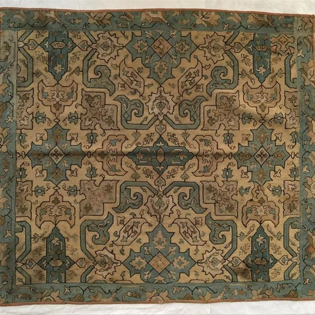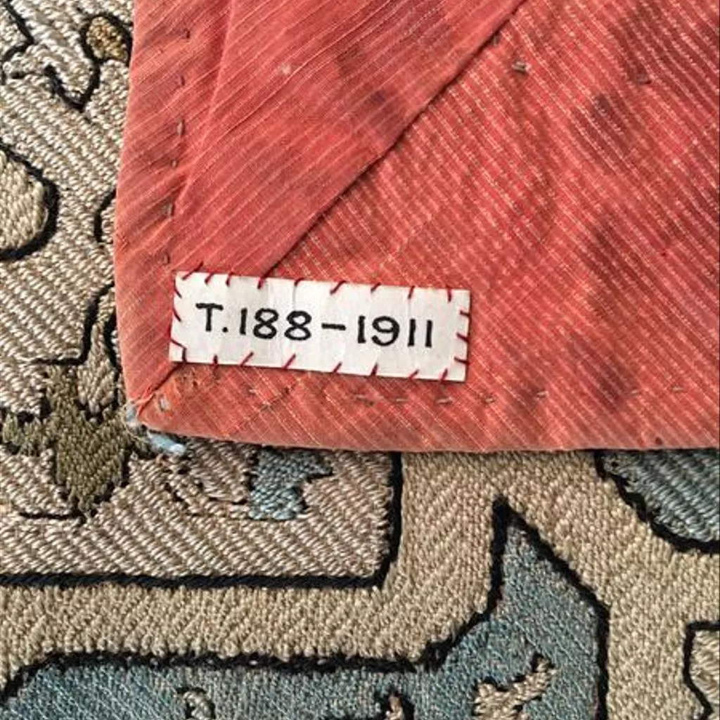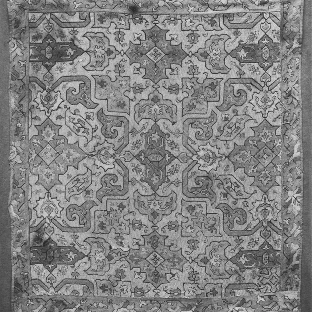Plain weave cotton embroidered with silk in surface darning on the diagonal and running stitch, backed with plain weave silk and faced with bias-cut plain weave silk and plain weave cotton and silk. The surface darning is worked to create a herringbone twill effect. The border has been cut and re-stitched and may have come from another embroidery; there are also three small patches [on the opposite corner to the Museum Number] from other embroideries. The cover has a longitudinal axis pattern of an elaborate cross form in blue, leading into a fleur de lys form in faded red, either side of a central darker blue cartouche. This pattern is repeated laterally by the upper and lower border. The rest of the field is infilled with two [three-quarters complete] notched and broken octagonal forms outlined in light blue enclosing S-shaped leaves and a larger version of the elaborate cross form. All motifs are infilled with stylised floral elements. The border is blue with an incomplete pattern composition based on a thin black stem carrying buds, flower heads and leaves in the same colouring. The patches are in surface darning on the diagonal, but with no change of direction.