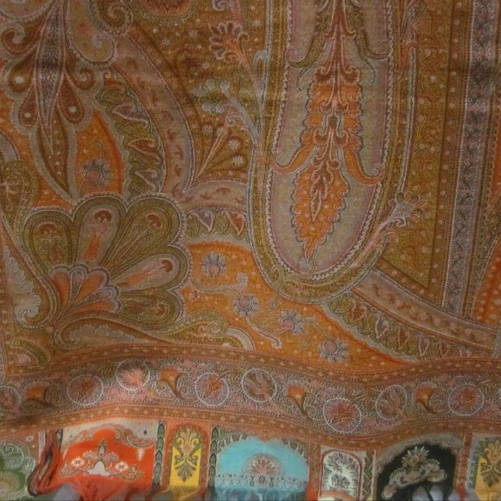 Woven woollen shawl, made by David Speirs & Co., Paisley, 1862 Woven woollen shawl with a design repeat that fills a quarter of the shawl. Round all the four sides, within the two decorated shallow end panels, runs a stylised meander with four flowerheads haloed by rings reserved in the filling pattern. At each corner of the main design, a palmette fans out from an arc woven with the name 'D Speirs & Co' (reserved on two corners). Three huge arches containing elongated sinuous pines, their outlines spouting little flowers, are set against an elaborately detailed variety of filling patterns. The centre sides have less high arches. At the centre the points of the central end arches meet to flow out into gothic foliate ornament to either side. No plain ground is to be seen except in the brightly coloured harlequin end pieces.