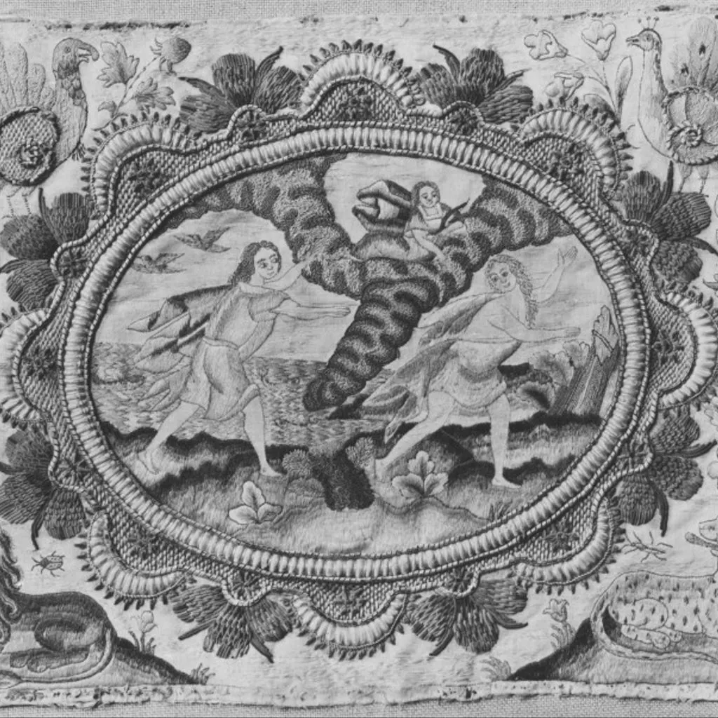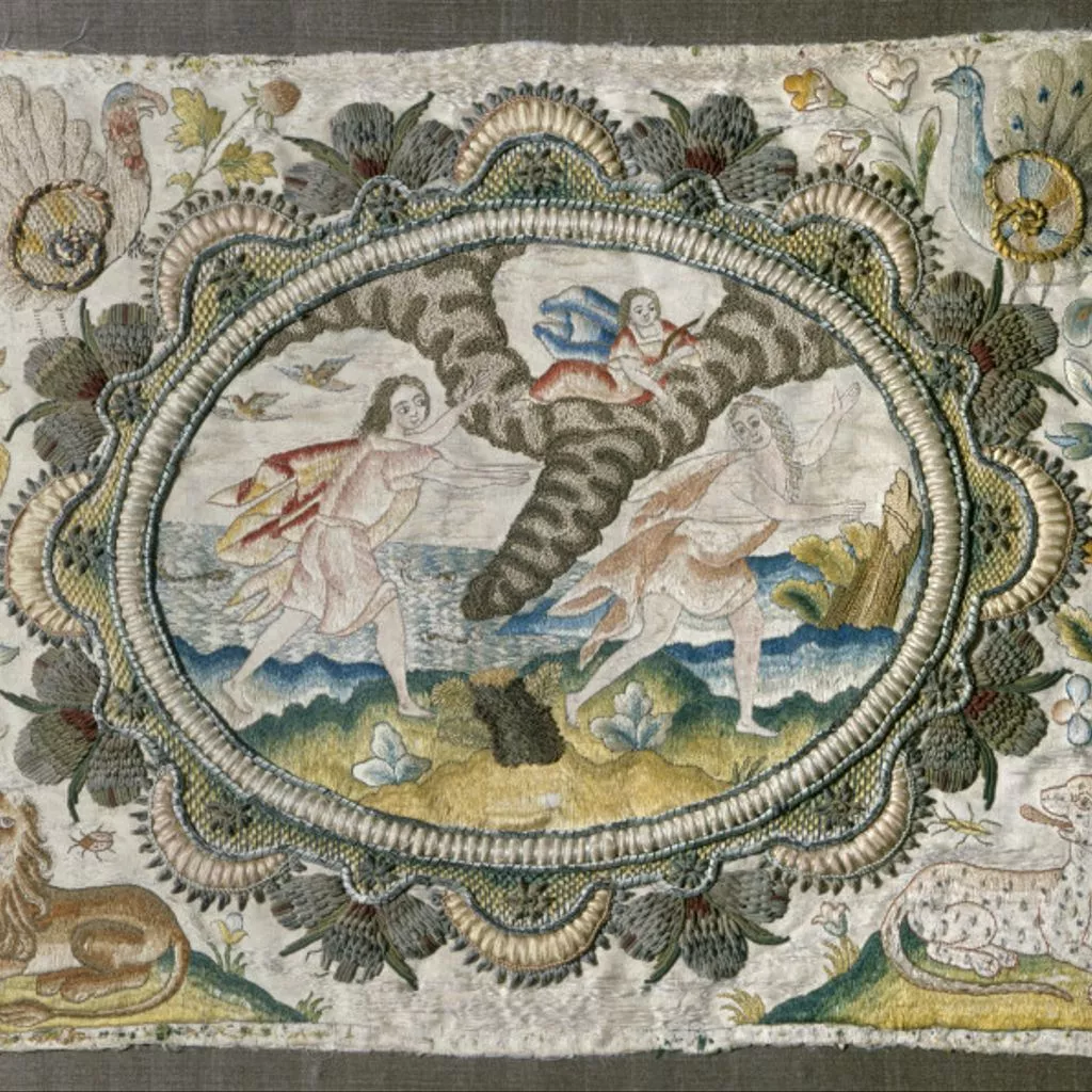 Unique Picture, embroidered satin depicting the pursuit of Arethusa by Alpheus, observed by a woman in the clouds (possibly Artemis, or another view of Arethusa concealed by Artemis amongst the clouds.). Contained within an embroidered oval frame, the outside corners of the fabric containing a lion, a leopard and various flowers. embroidered, 1630-1650, English; Alpheus and Arethusa