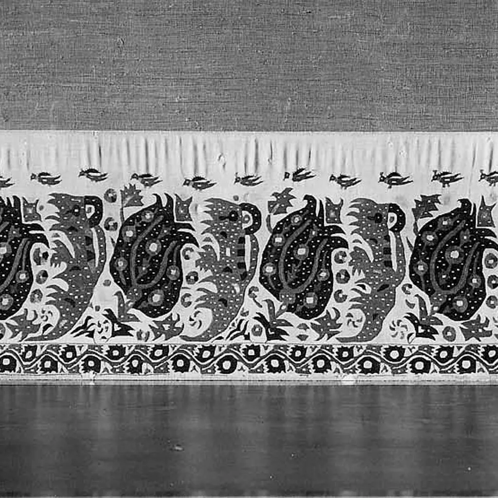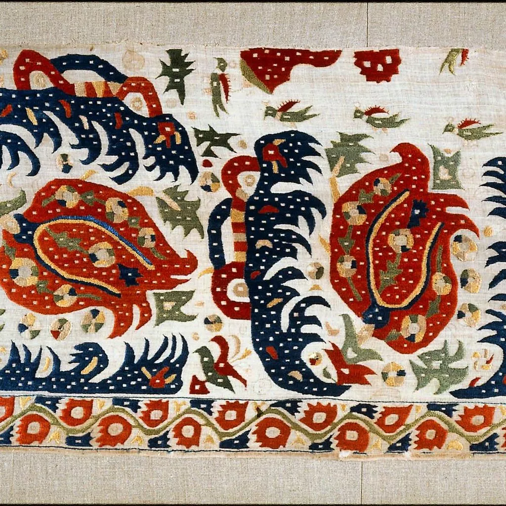 Unbleached linen(?) embroidered with design of large red tulip-shaped buds detailed with stems bearing circular flowers, and blue leaf-like forms. Smaller forms are scattered over the ground. Border on three sides has design of undulating stem bearing red, blue and yellow leaves. Worked in deep blue, red, yellow and light green silks.