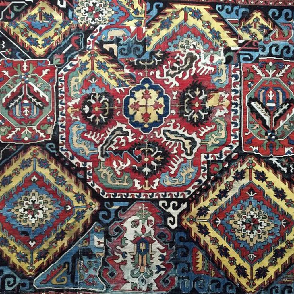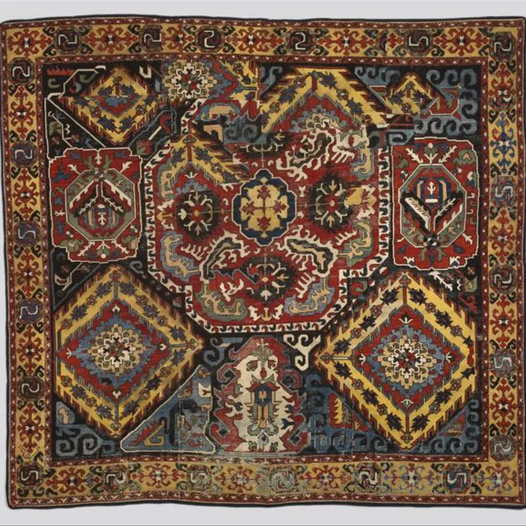 Middle East, Textile; Panel, silk-embroidered cotton, cut down from larger textile, design of lobed medallions and cartouches on black ground, Azerbaijan or NW Iran, 1670-1700 Plain weave cotton embroidered with silk in cross stitch. The design has been dyed onto the ground using a resist and indigo, with a facing of bias-cut plain weave silk, a backing of plain weave glazed cotton and traces of bronze coloured felt which could be the remains of an original woollen backing or the remains of an interlining which has become felted. The ground fabric has been pieced, cut and rejoined so that the design is disrupted. The ground is black and the pattern originally consisted of a red quatrefoil device in the centre outlined in white, with blue and red. Around this are rectangular red blocks and large yellow and red lozenges symmetrically arranged. These forms are filled with stylized floral and geometric motifs. There is one red palmette along each end, and a border in which a swastika within an octagon alternates with pointed cartouches. Colour (Embroidery threads, 2S silk): black, white, yellow, yellow [faded to beige], blue varying in shade from mid- to light, green, red; (Facing): dark blue silk; (Backing): green glazed cotton.