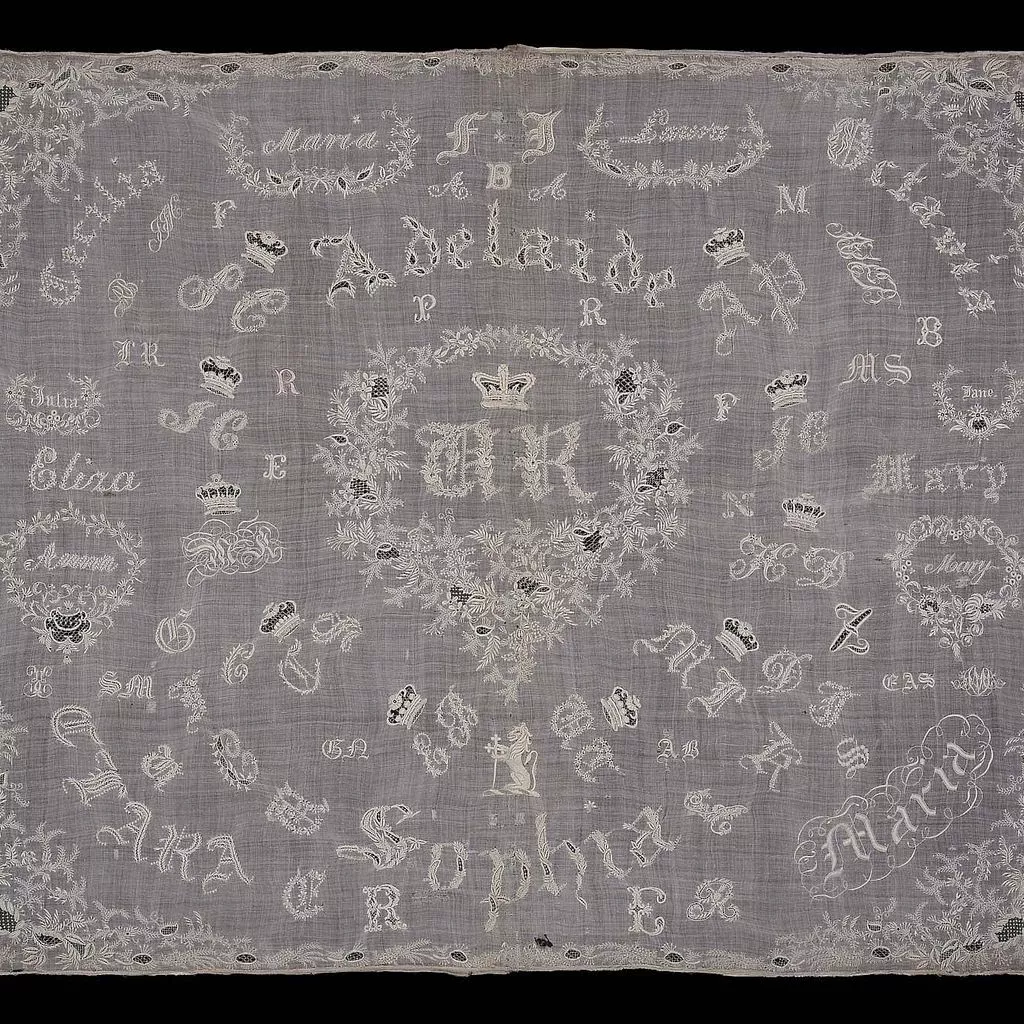 Trade sampler. Fine white linen ground on which initials, ciphers, and coronets are worked with white linen in satin stitch. Some names have German, some have English form. Embroidered with initials, ciphers, and coronets worked in satin stitch. Initials in center "A.R." possibly for Adelaide Regina, wife of William IV, Adelaide of Saxe-Melningen, married in 1818, formed by roses, thistles, and shamrocks. embroidered in satin stitch and cutwork with needlelace fillings.