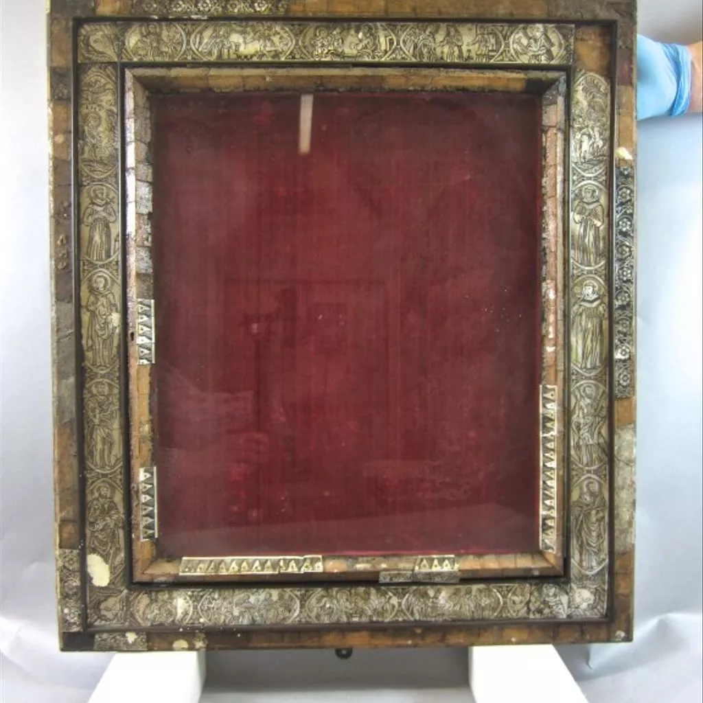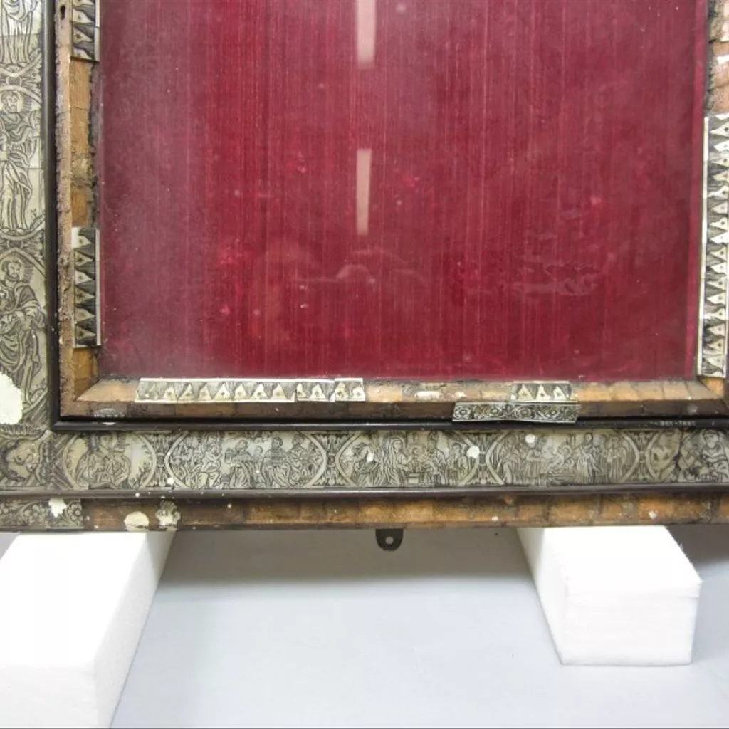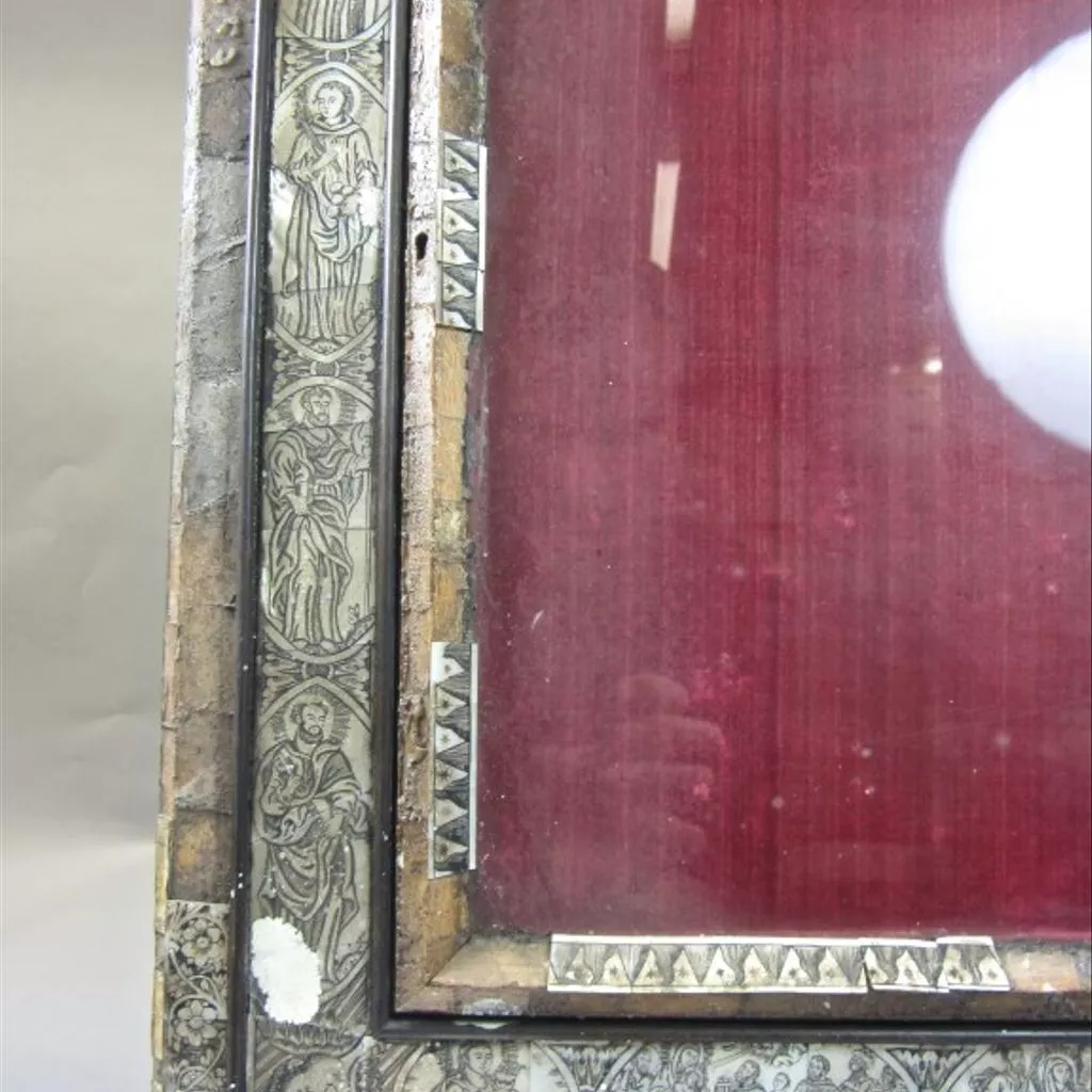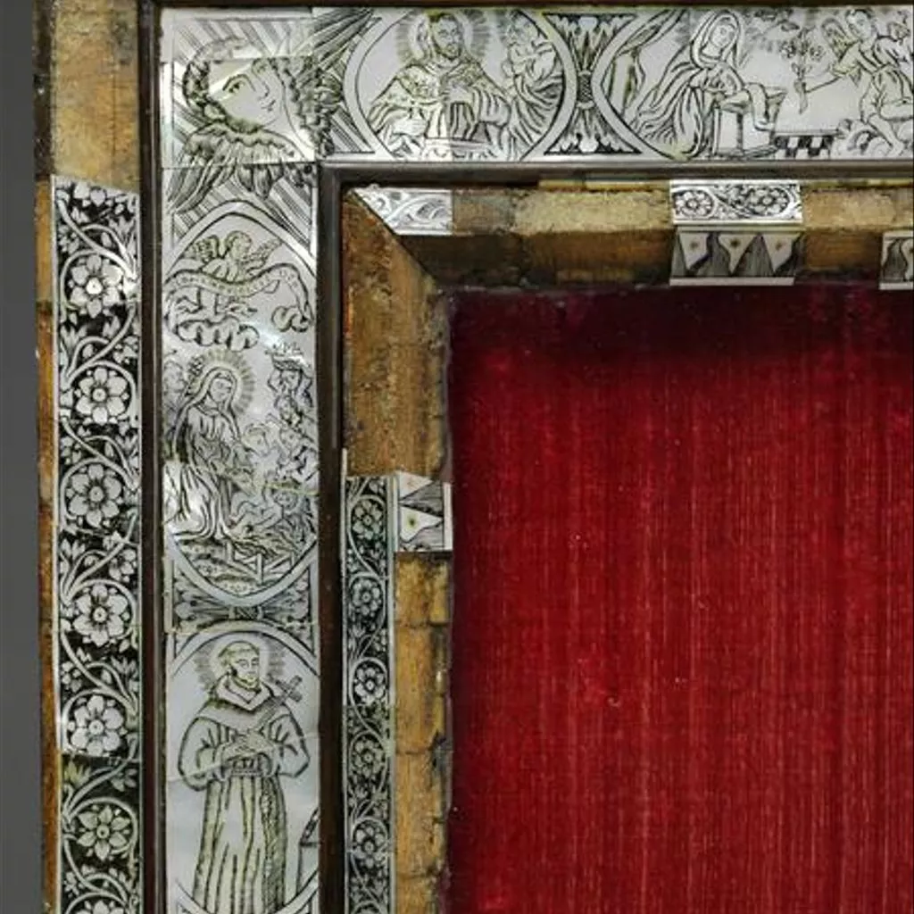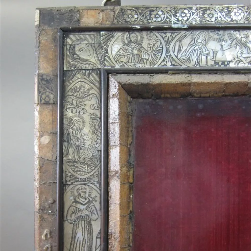 Wood, possibly walnut, veneered with mother-of-pearl on which are engraved scenes from the life of Christ, the figures of saints and floral borders, with two beadings of a dark wood. With a glazed door (the glass and locks apparently 19th century) which is fitted with a lock and key, accessing a recess lined with red silk velvet of 19th century date. Fixing holes suggest that a flat object was pinned onto the velvet lining. Modifications A section of engraved shell depicting a monk with a cross, at lower right corner (bottom) appears to be a replaced insert from another source, since the character of the engraving differs from the other veneers. Hanging Method The frame is fitted with three modern mirror plates. Behind the top two are squared mortices with signs of cord(?) wear, but it is not clear how these functioned. Wood veneered with engraved mother of pearl, with a glazed door in front of a velvet lined recess.
