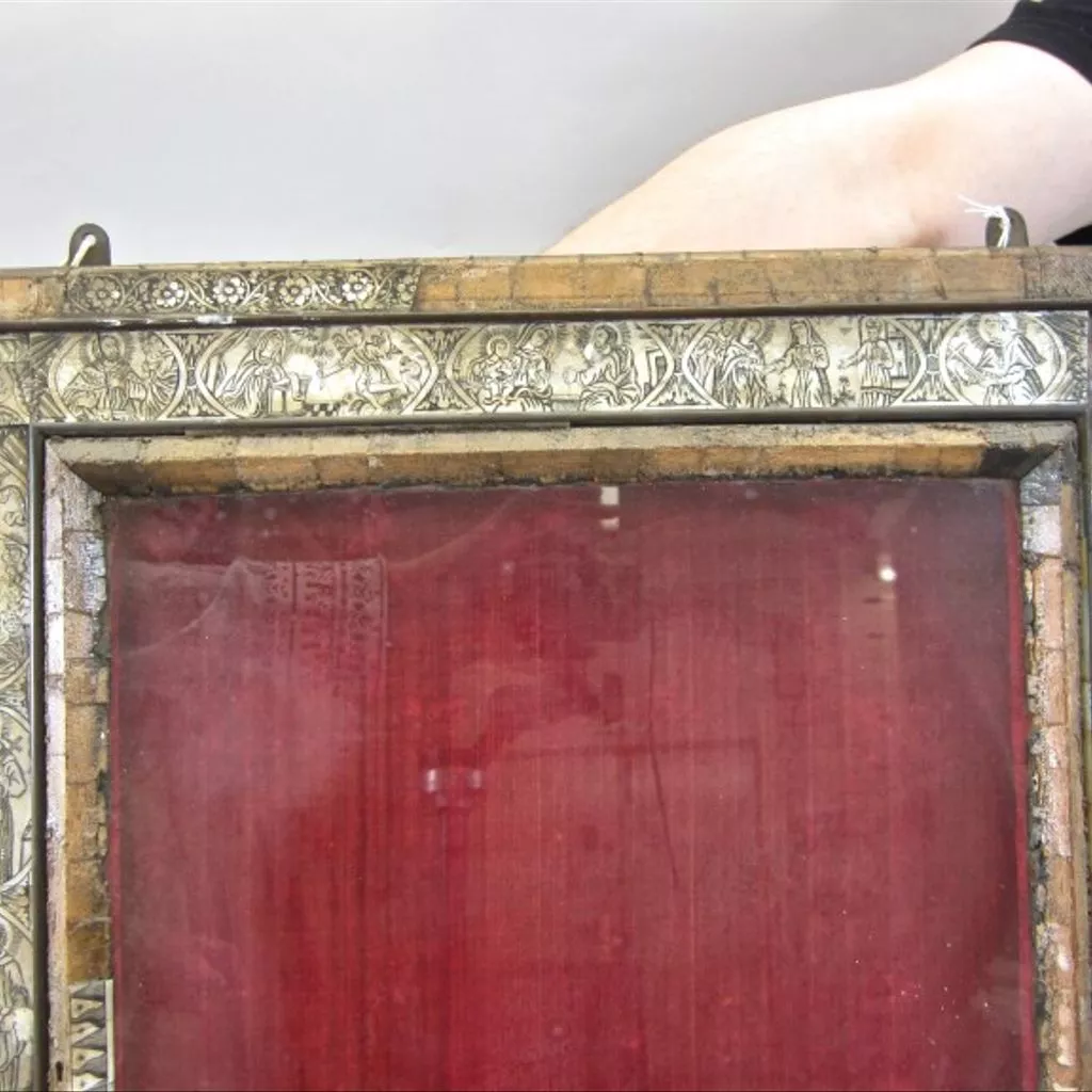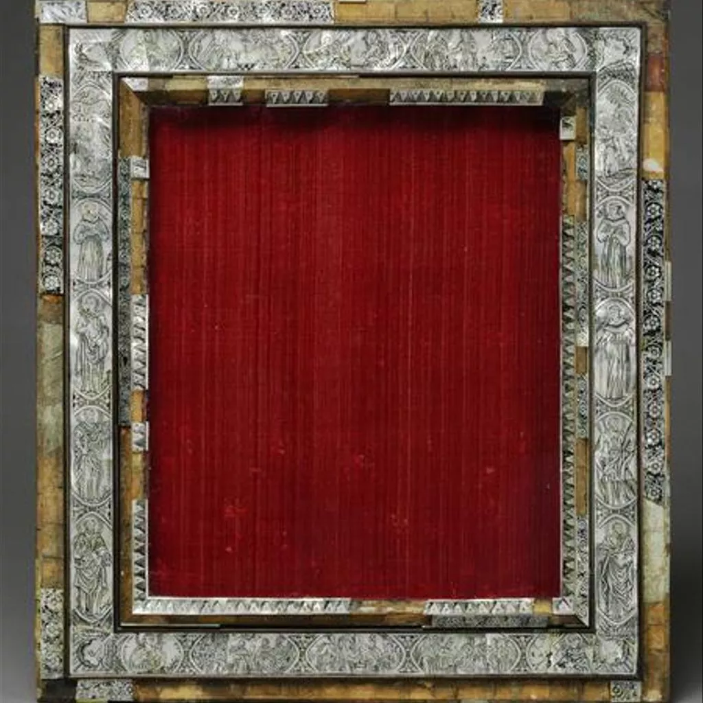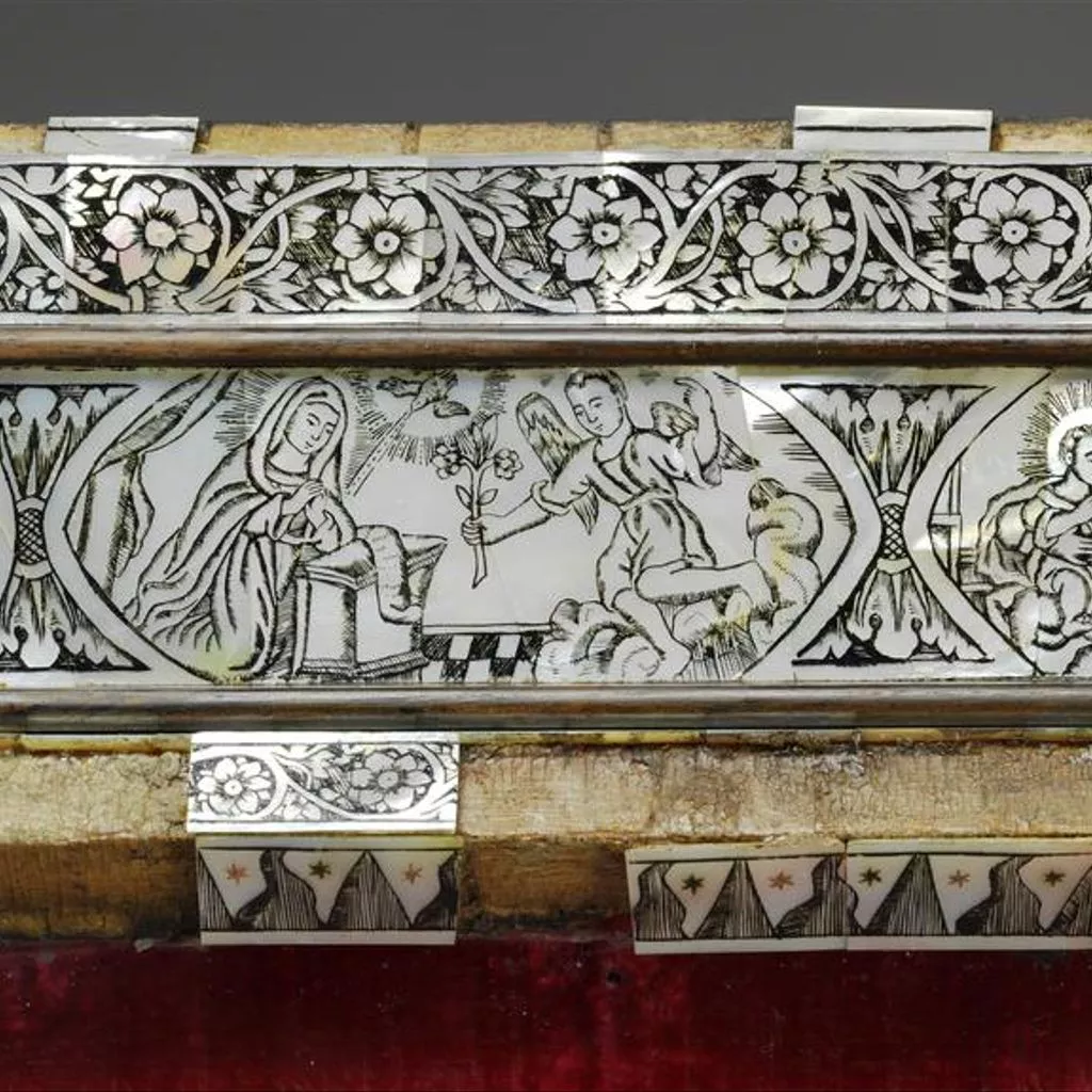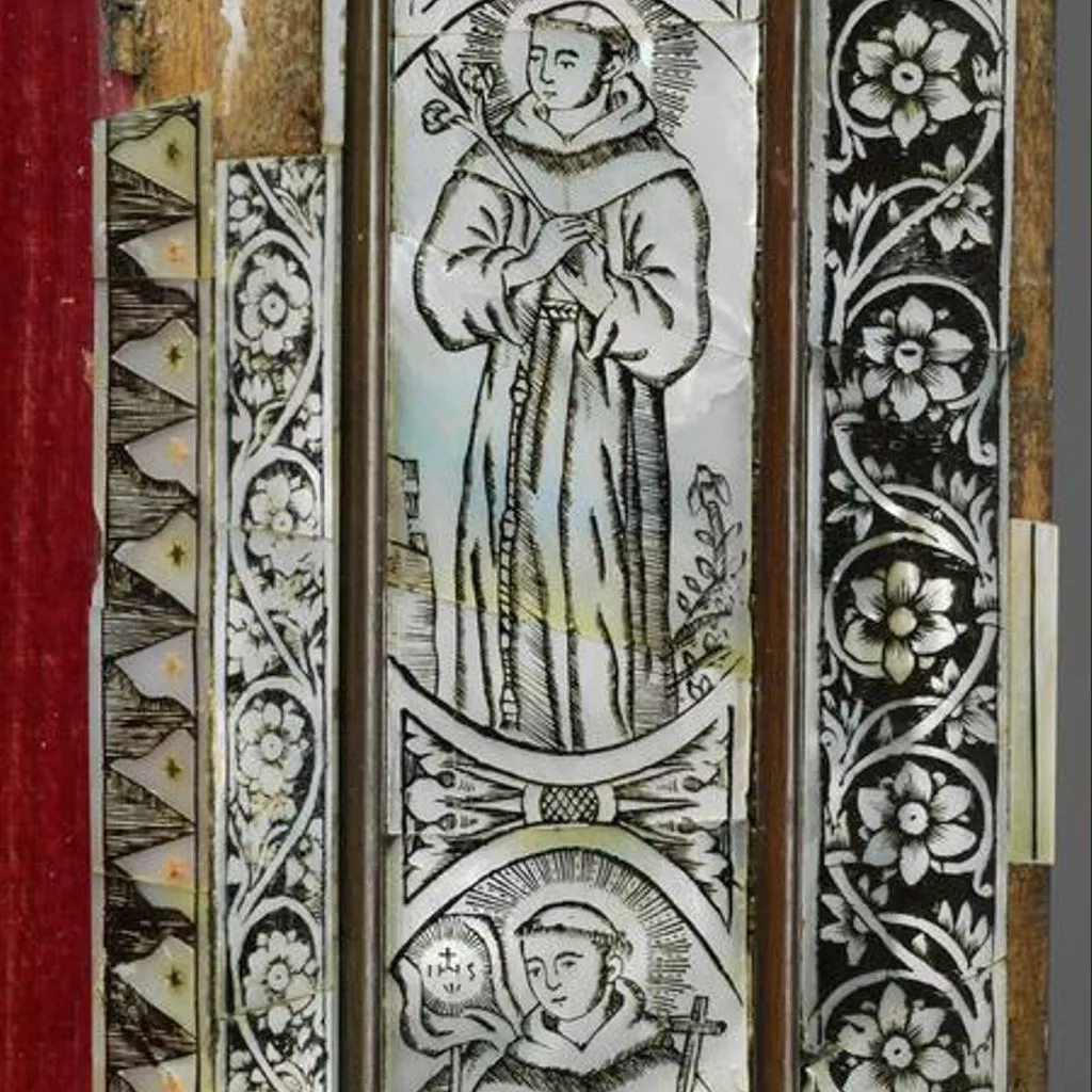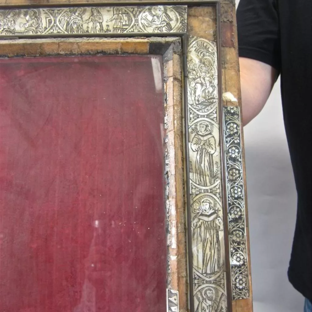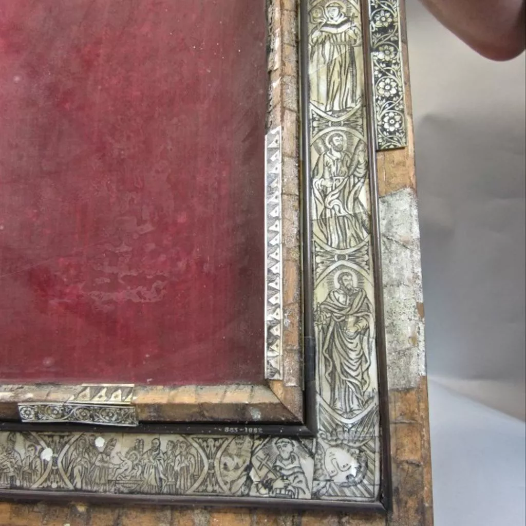 Wood, possibly walnut, veneered with mother-of-pearl on which are engraved scenes from the life of Christ, the figures of saints and floral borders, with two beadings of a dark wood. With a glazed door (the glass and locks apparently 19th century) which is fitted with a lock and key, accessing a recess lined with red silk velvet of 19th century date. Fixing holes suggest that a flat object was pinned onto the velvet lining. Modifications A section of engraved shell depicting a monk with a cross, at lower right corner (bottom) appears to be a replaced insert from another source, since the character of the engraving differs from the other veneers. Hanging Method The frame is fitted with three modern mirror plates. Behind the top two are squared mortices with signs of cord(?) wear, but it is not clear how these functioned. Wood veneered with engraved mother of pearl, with a glazed door in front of a velvet lined recess.