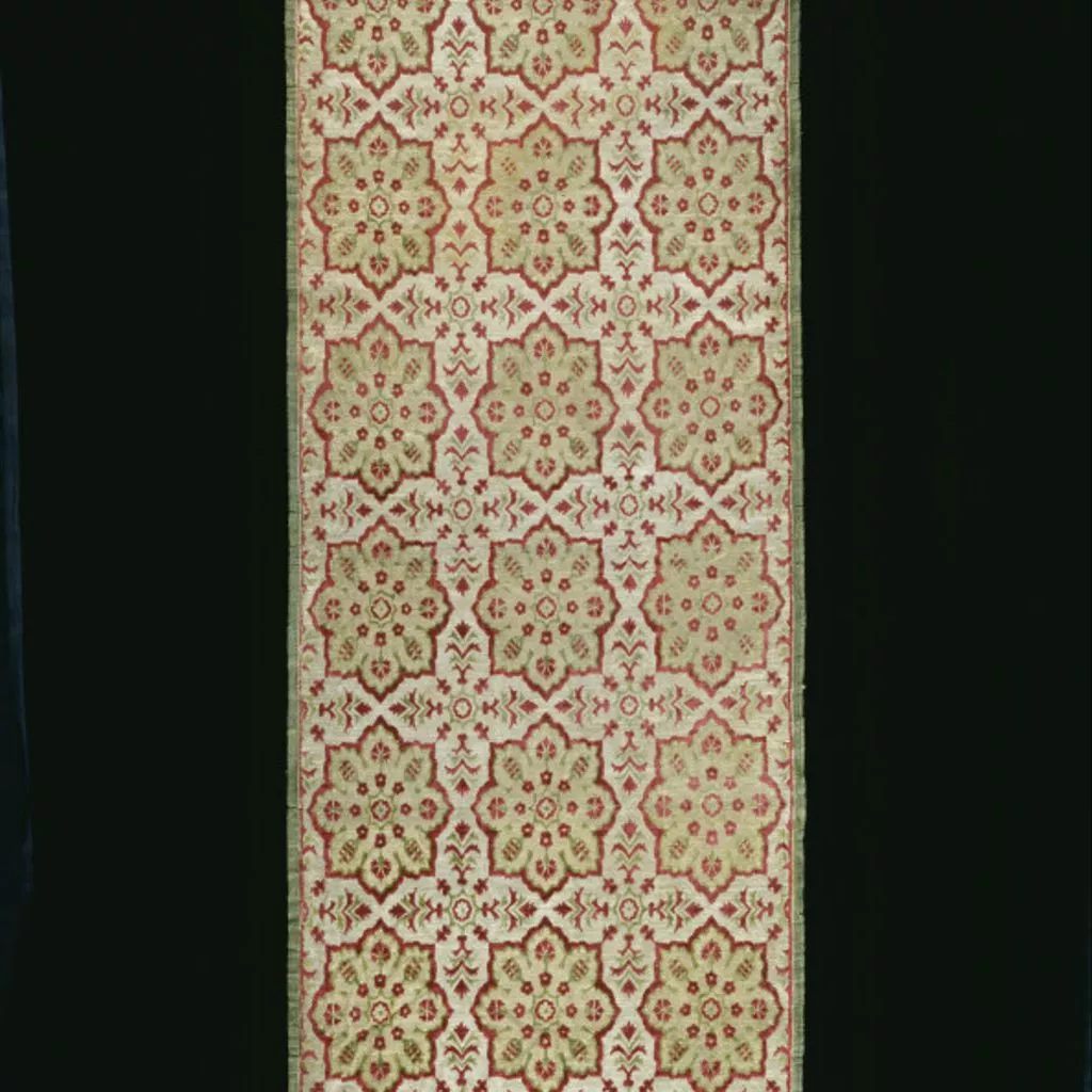 Jameel Gallery Velvet with Stars Turkey, probably Bursa 1600-50 Velvets with eight-pointed stars or medallions were woven in large quantities in Bursa from 1600 onwards. They were used for both furnishings and clothing, but as the design was employed so widely, it was considered too common for the most prestigious kaftans. Silk velvet Museum no. 87-1878 [2006-2012] Length of silk velvet with 8-pointed star design. Silk velvet with eight-pointed stars, Turkey (probably Bursa), 1600-50. This piece of silk velvet could have been used for furnishings or clothing. It was made in Bursa, in north-west Anatolia in Turkey. Velvets with eight-pointed stars or medallions were woven in large quantities there from 1600 onwards. They were used for both furnishings and clothing, but as the design was employed so widely, it was considered too common for the most prestigious kaftans. Bursa was the main centre for silk-weaving under Ottoman rule. The industry was established there in the 15th century, largely to compete with Italian imports.