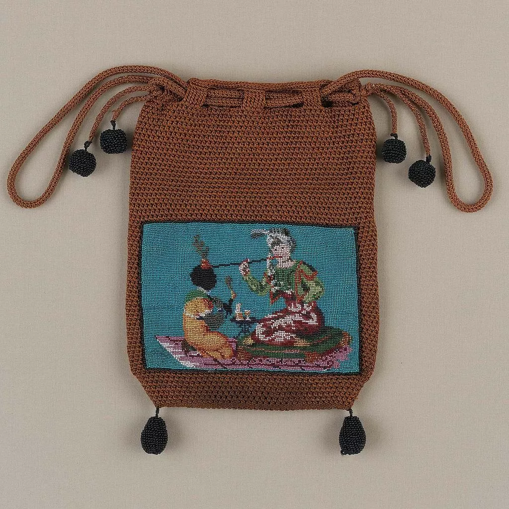 Brown silk crochet with beadwork panel on cotton foundation. Polychrome panel design on blue ground: white man and black man smoking pie in Arab costuem, black border. Brown silk crochet drawstring with 4 black bead-covered wood tassels, 2 tassels at base. White silk lining.