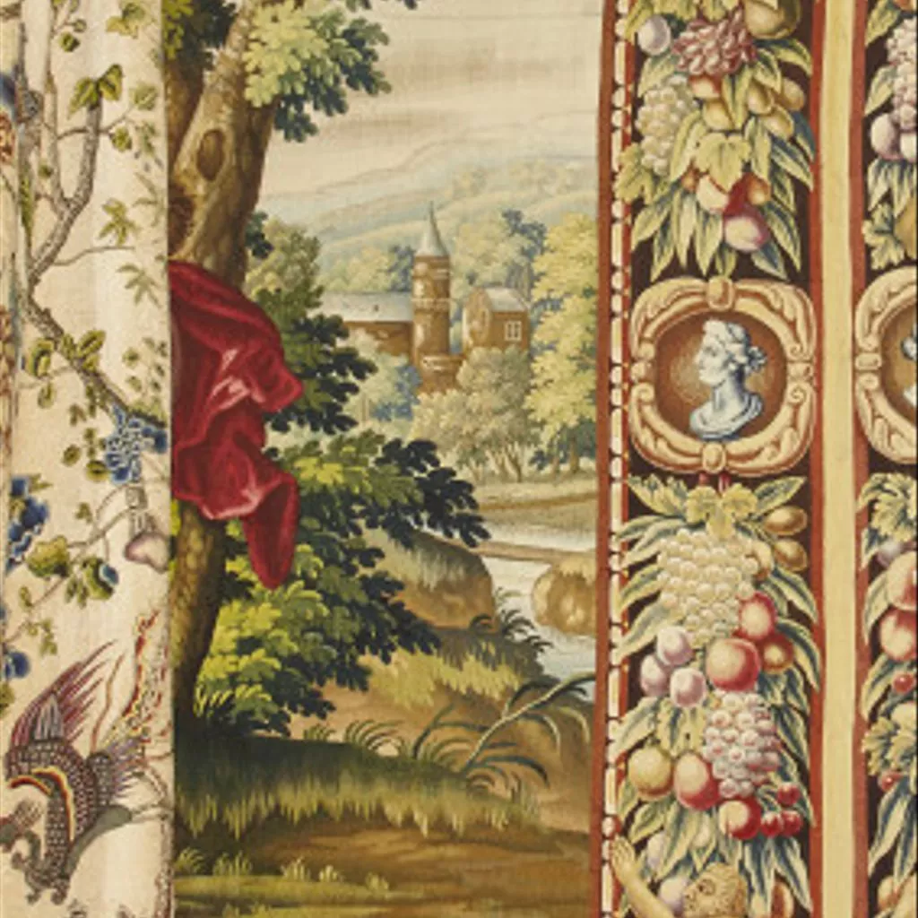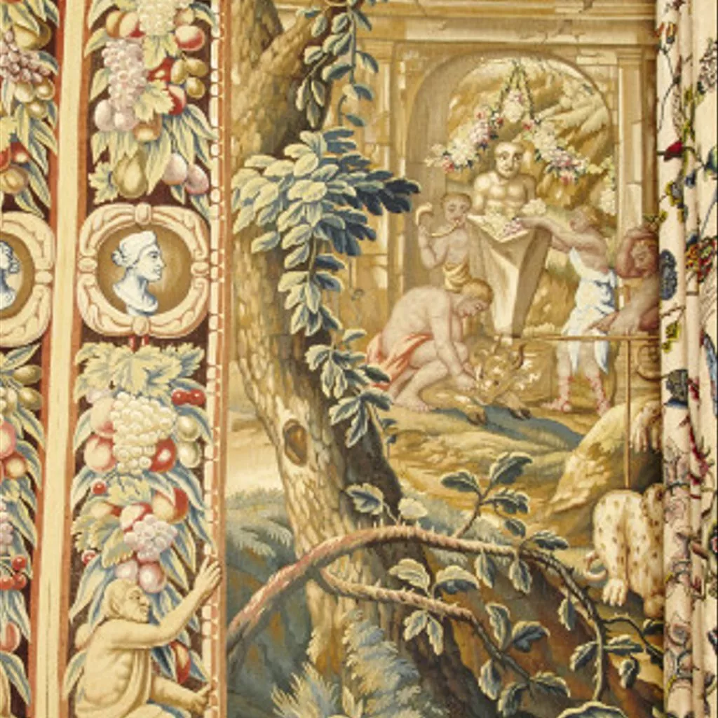 The three tapestries depicting scenes from the story of Bacchus are the only examples known of this design, and have unusual borders, which seem to have been designed especially for the series. On loan to Houghton Hall. Tapestry with unknown subject from the Story of Bacchus set, 1660-99 Tapestry hanging in wool and silk. The tapestry is hung behind a large bed, and so only a small area can be seen at the left and right sides. [it has probably been hung in this location since the 18th century, so there is no record of the whole tapestry having been seen]. The left side appears to show the preparation for sacrifice of a bull and the right a cloaked figure, in a woodland scene. The border design has satyrs and medallion busts of Bacchus and Ariadne, among swags of fruit.