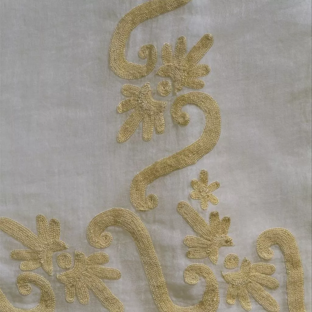 This elegant gown, with its high waistline and flowing train, is a fine example of the Neo-classical style of dress that was fashionable in Britain and France at the turn of the 18th and 19th centuries. Diaphanous Indian muslin fabric from Bengal was the perfect material for the new, lighter and less tailored styles, which were often complemented by the equally fashionable Kashmir shawls. The chain-stitch embroidery was also done in India, using the naturally golden-coloured tussore (wild) silk of Bengal. The designs on this dress recall the Neo-classical motifs that were popular in many media in Europe at that time, and are another indication that the fabric was intended for use in the West rather than in India.