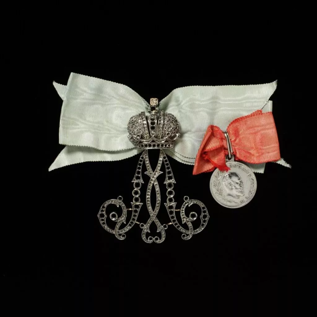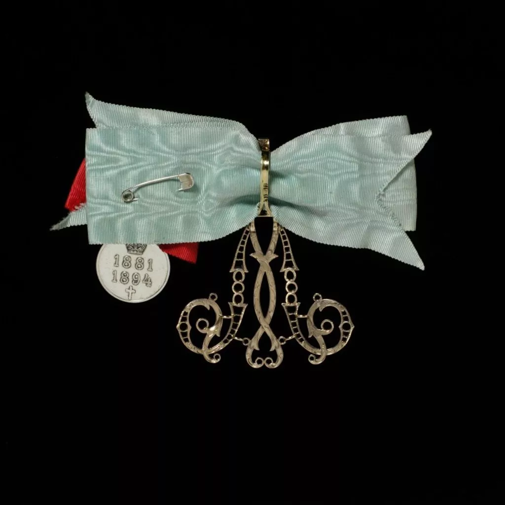 Silver frame for a badge, backed with engraved gold, in the form of an M surmounted by the Russian Imperial crown with a gold maltese cross. Attached to a blue ribbon of watered silk and a red ribbon with a silver medal commemorating Tsar Alexander III, Russia, ca.1890 Silver frame for a badge, backed with engraved gold, in the form of an M surmounted by the Russian Imperial crown with a gold maltese cross. Attached to a blue ribbon of watered silk and a red ribbon with a silver medal commemorating Tsar Alexander III.