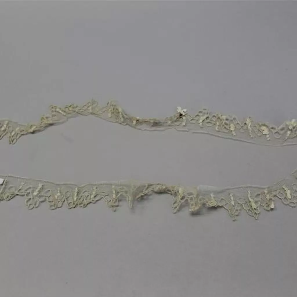 Dress trimming border of blond silk bobbin lace with small white flowers stamped out on woven fabric, possibly cotton. The lace has been worked as a very open mesh with some outlining in gimp thread. One edge is straight and the other scalloped. The fabric flowers have been sewn alternately to the points and the centres of the scallops. Dress trimming border of silk bobbin lace, possibly made in Caen or Bayeux, 1855-1865