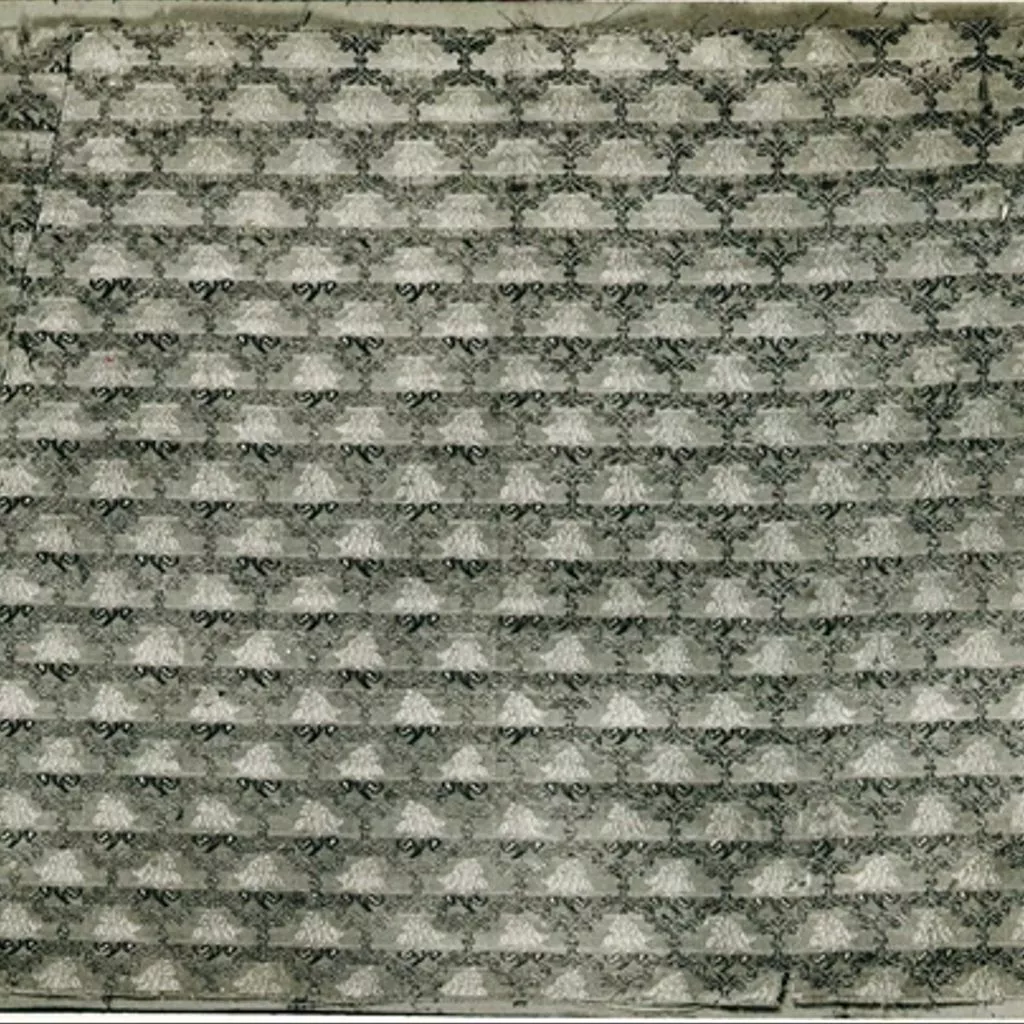 Armatura in raso prodotta da un ordito di fondo in seta bianca/opera per trame broccate legate in raso in seta marrone, gialla e marrone