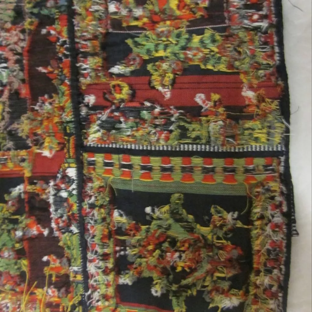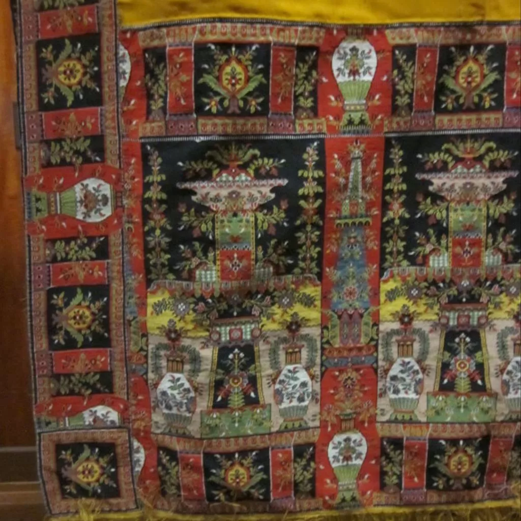 Long woven shawl with the border 16 inches deep with guard stripes. With a bizarre design of vases, obelisks and pedestals with shallow basins, all sprigged with flowers, set against plain areas of scarlet, black, lemon yellow and buff. Other colours are white, green, and grey blue. Narrow border along the side of the shawl with a vase between architectural blocks with short pilasters, is repeated as the upper and lower guard-stripe, and from the vases in the lower guard-stripes flowers project into the main area of the border.