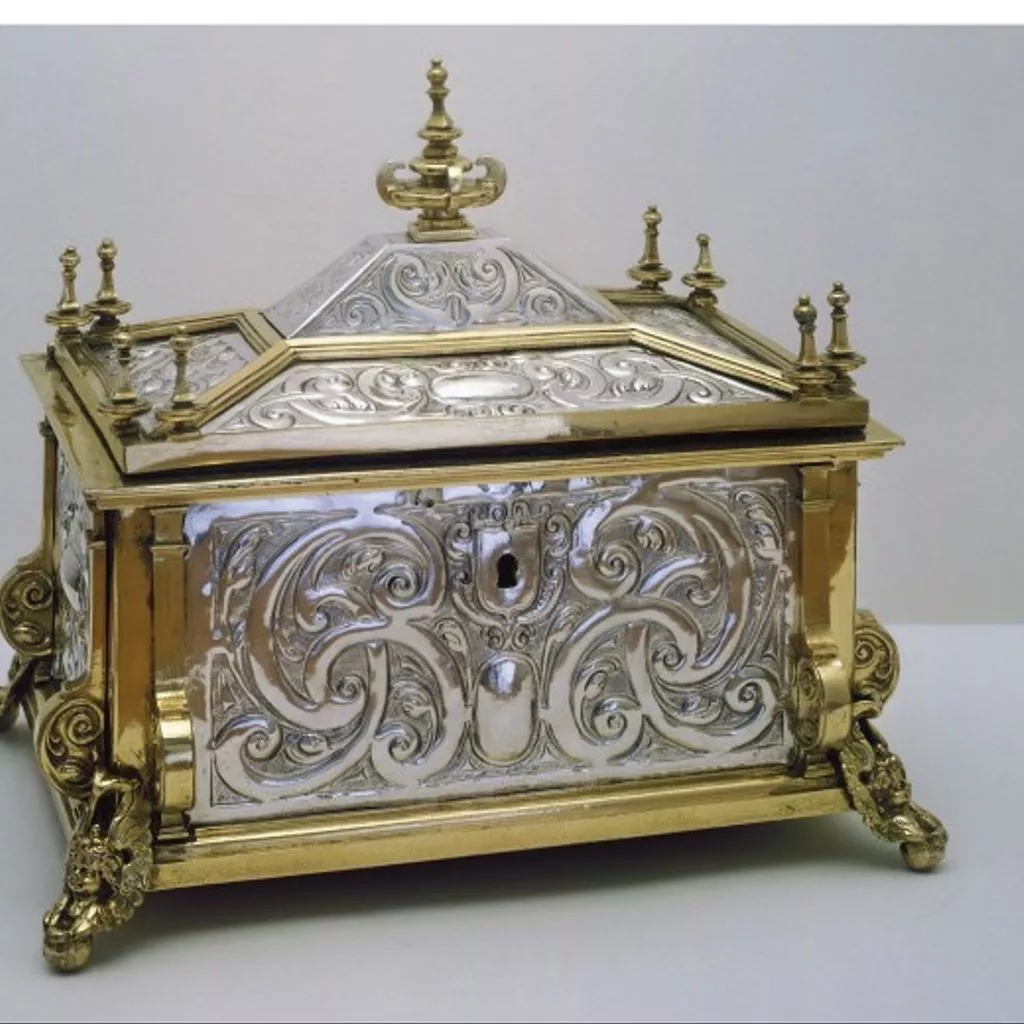 This casket with a wooden core and silver panels appears at first to be for everyday use. Its embossed strapwork, pinnacles, ball feet and winged cherub heads are all secular in character. Its function however was religious. Inside, the box has a red damask silk lining and a cloth of beige silk with a colourful floral embroidery and an IHS-monogram with three nails representing Christ's Passion. Such caskets were known to contain the Eucharist or relics. Some examples of this type have a lid surmounted by a cross.