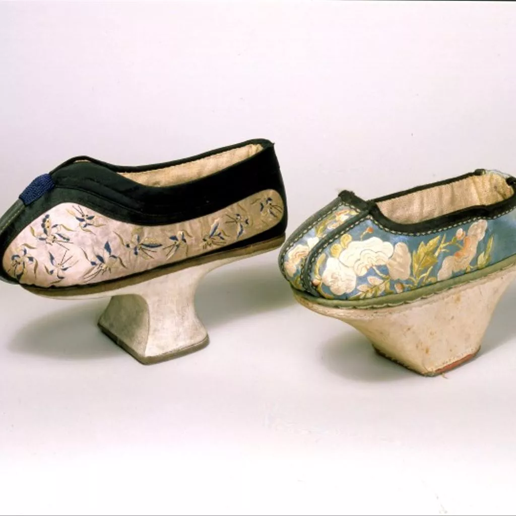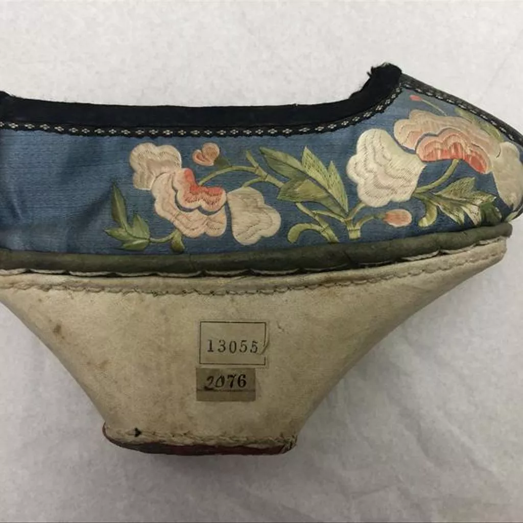 Pair of woman's shoes, from Shache (Yarkund), ca. 1873 A Manchu shoe for women of lower ranks characterised by its thick boat-shaped convex sole which consists of a wooden frame upon which white cotton cloth is stretched, with its heel covered in red cotton. It has a light blue silk satin upper densely embroidered with floral and plant motifs in pink, beige and green silk threads which extends to its vamp whose edge is outlined with a leather-like material, and a heel band lined in light blue silk satin stitched onto the back of the shoe.