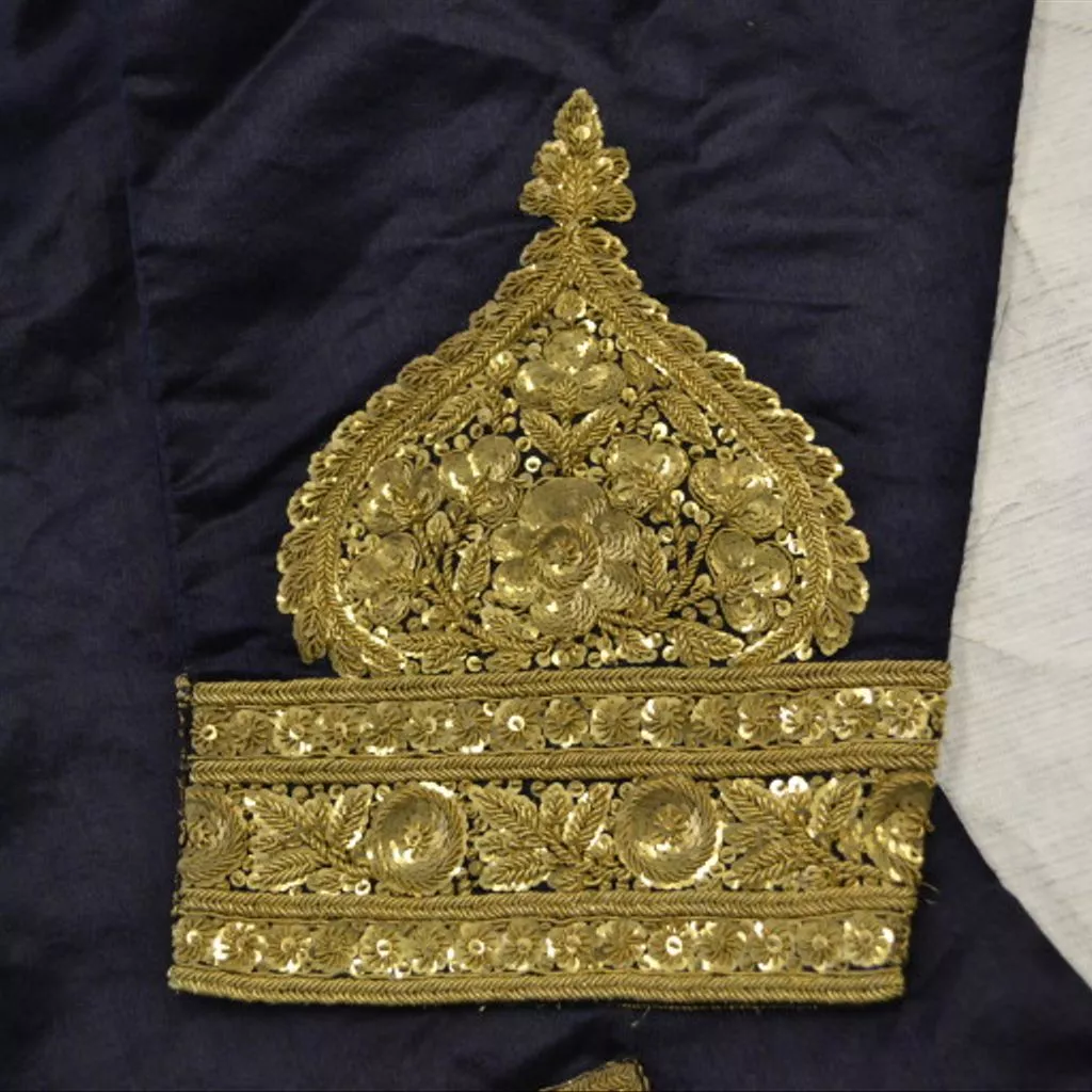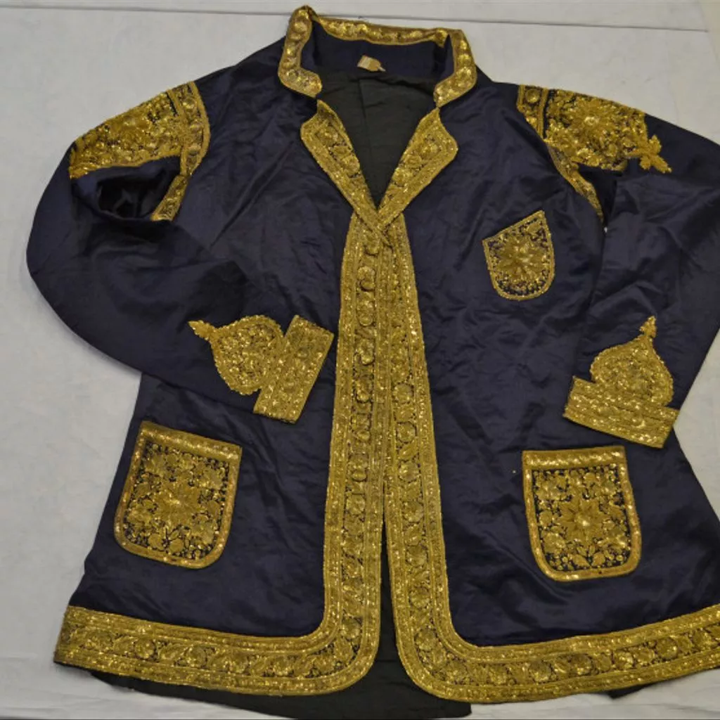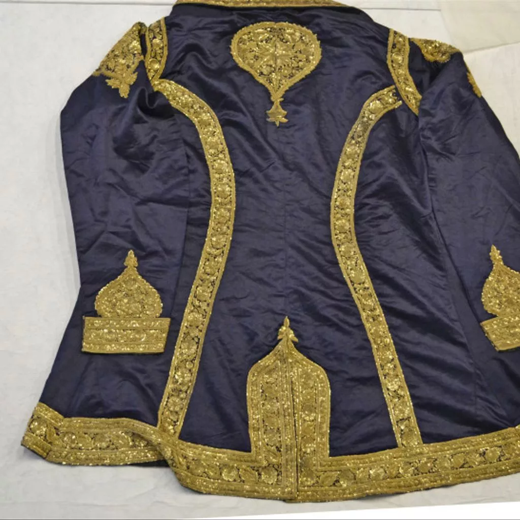 Intended for use as a garment, clothing. Man's coat, dark blue satin lined with black silk, pockets, hems, collar and shoulder have applied decorations of gold-wrapped thread and sequins in floral designs. Textile, coat, blue satin gold, embroidered, Kumbakonam, ca. 1870