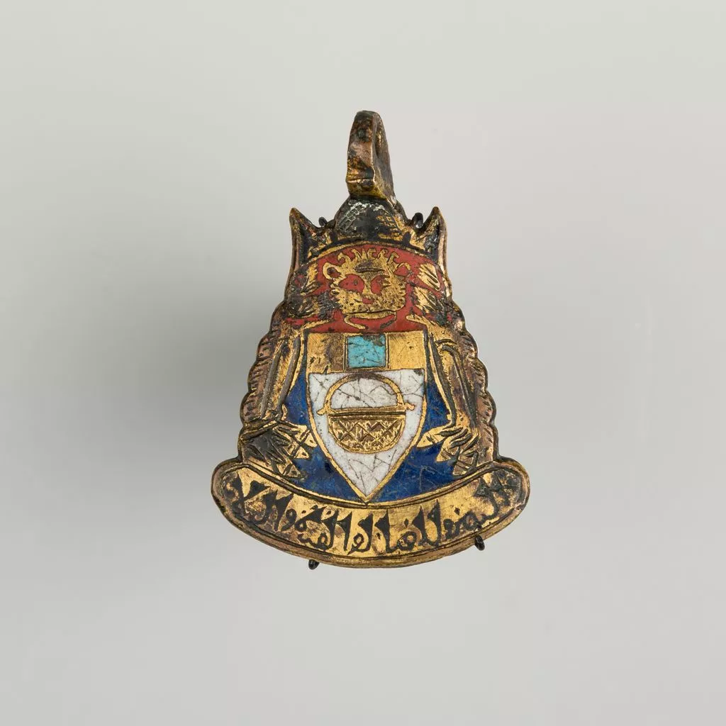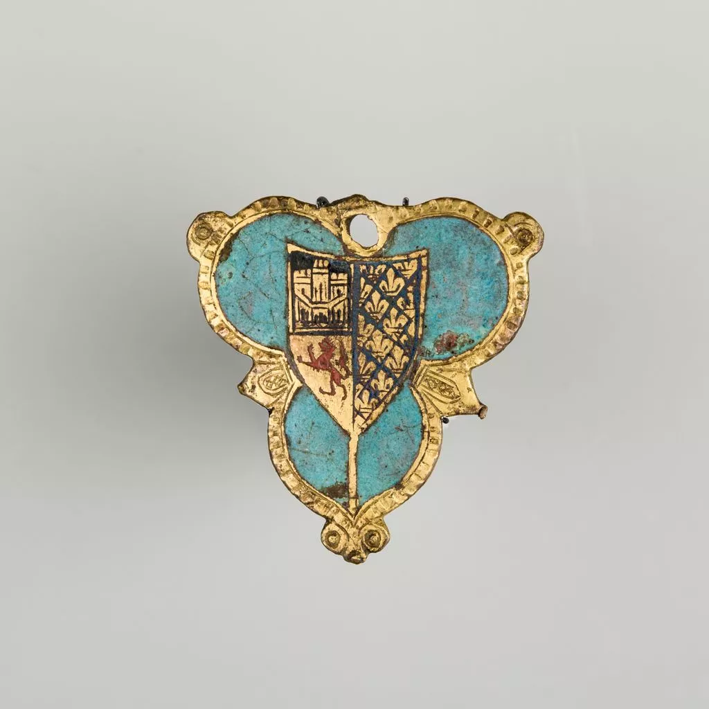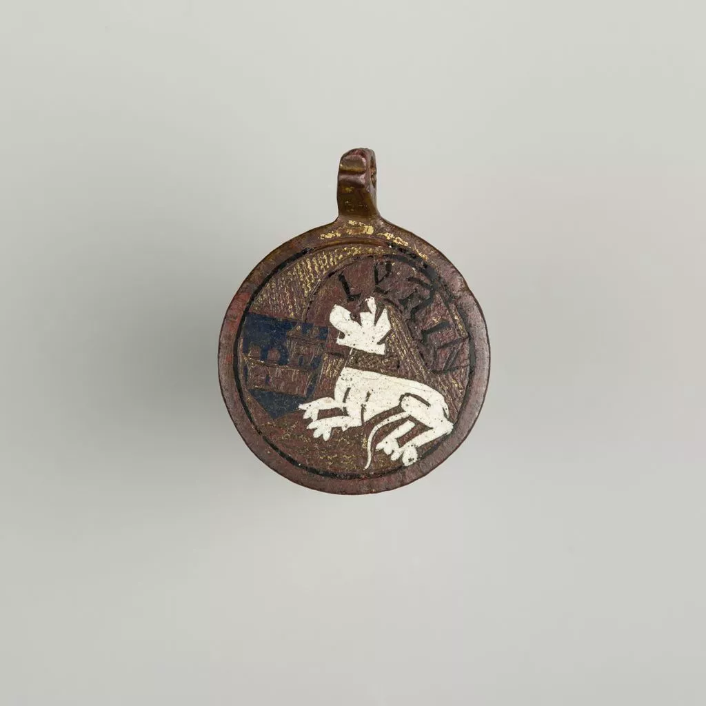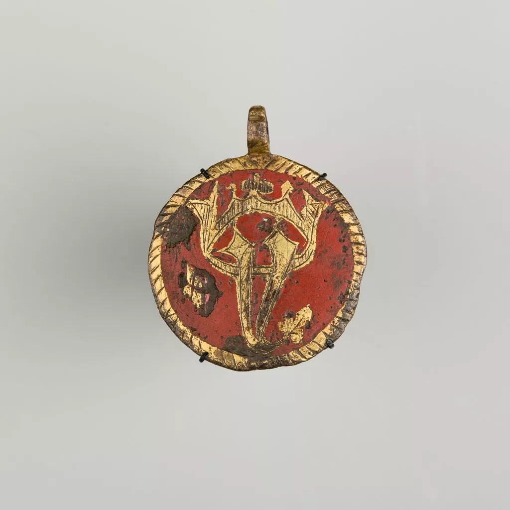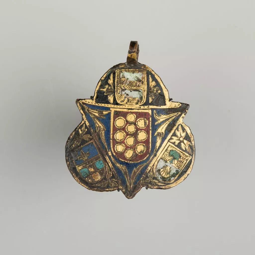 Heraldry, or coat-of-arms, were vitally important in Europe throughout the Middle Ages and the Renaissance. Heraldic emblems were used to identify noble families, cities, regions, and even countries. In addition to being displayed on shields and flags, heraldry was incorporated into architectural decoration on the interior and the exterior of buildings, on furniture, works of art, clothing, and horse equipment. Harness pendants, like this example, would have been attached to a headstall, bridle, or other straps making up the tack of a horse ridden by a nobleman or noblewoman, or a member of their household. Many harness pendants also have decoration that is simply ornamental, or have symbols that are not specifically heraldic in nature.