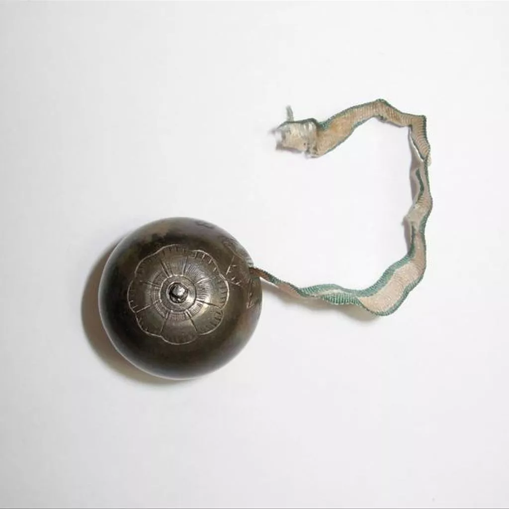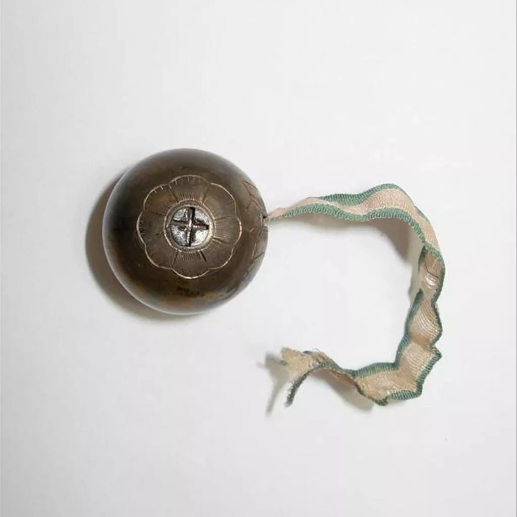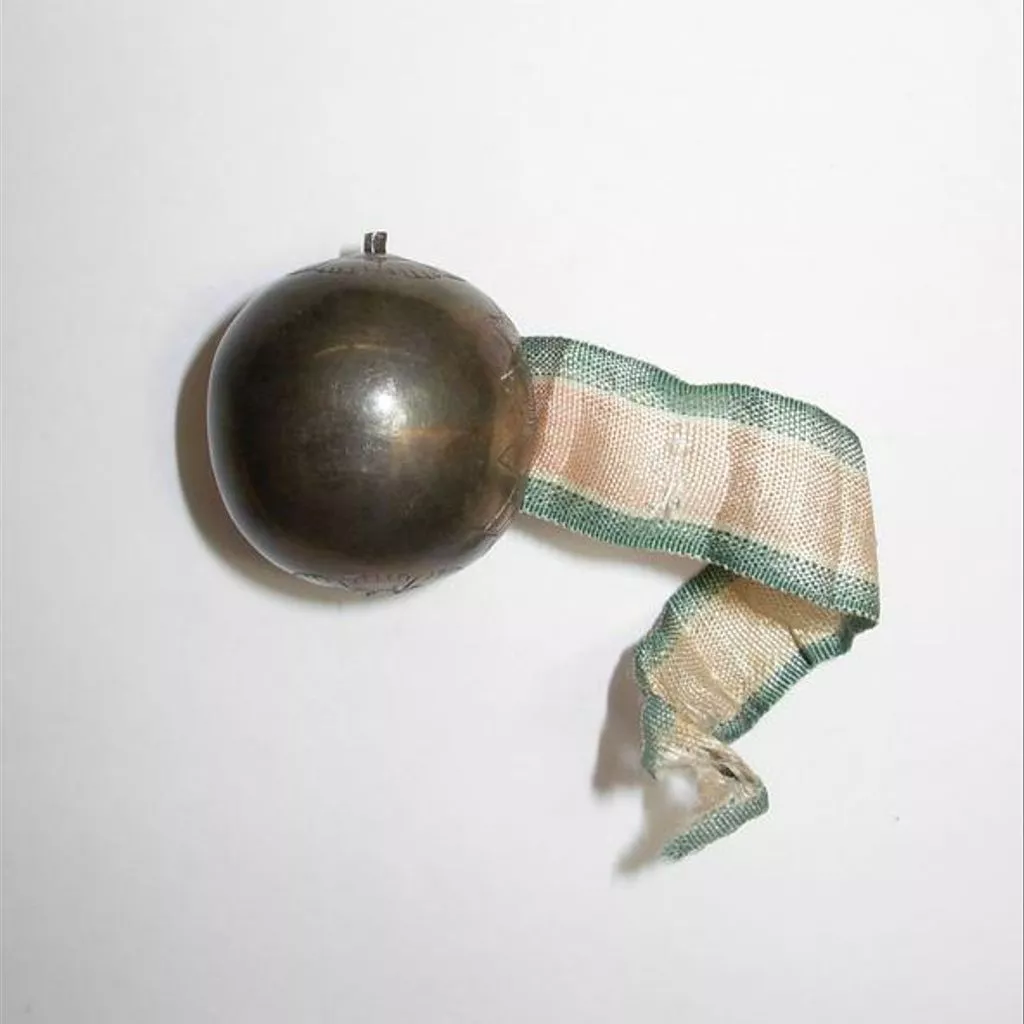 Silver-coloured sphere with a central spindle inside. A yard measure of pink silk ribbon with green edges, which emerges through a slit on one side of the sphere, is wound round the spindle. The ends of the spindle are visible on the outside of the sphere, but lack terminals. The border of the slit, and the two holes over the ends of the spindle, are decorated with a simple engraved pattern of stylised petals. Spherical silver tape measure container with engraved decoration holding a silk ribbon, Europe, 1700-1750.