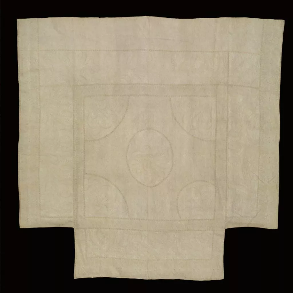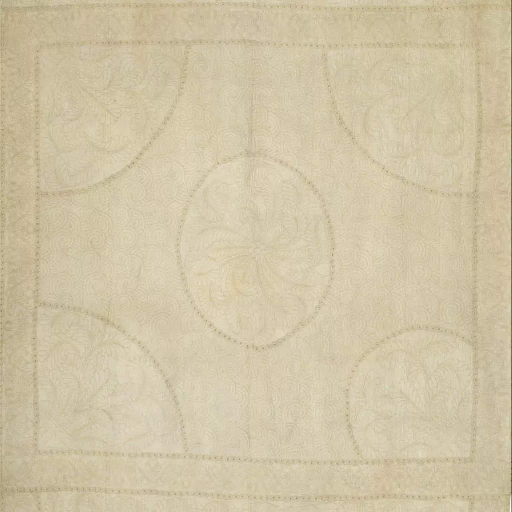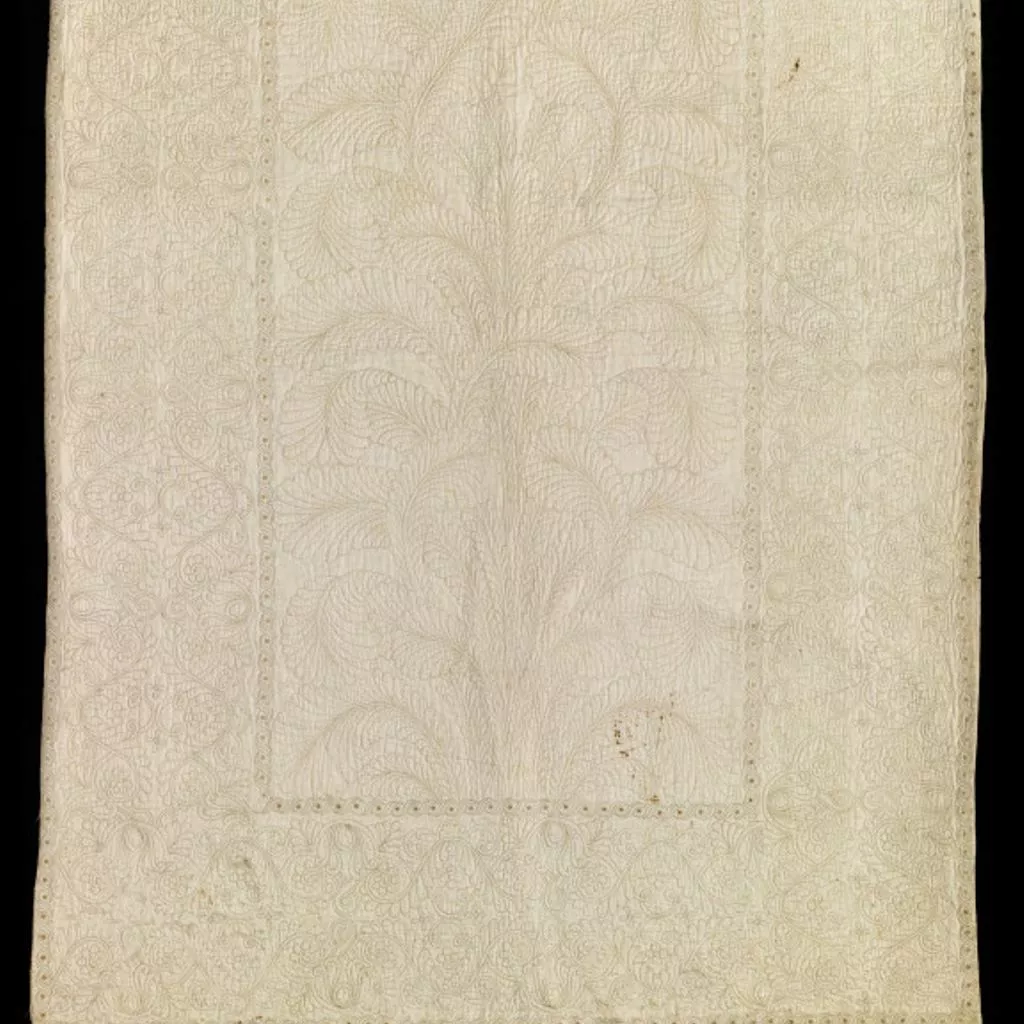 Quilting is a method of stitching layers of material together to form a decorative design. Flat-quilting is where two pieces of cloth are stitched together with no wadding in between. A single or double line of stitches creates the pattern. Early examples such as this often use back stitch rather than running stitch to achieve a flush design.