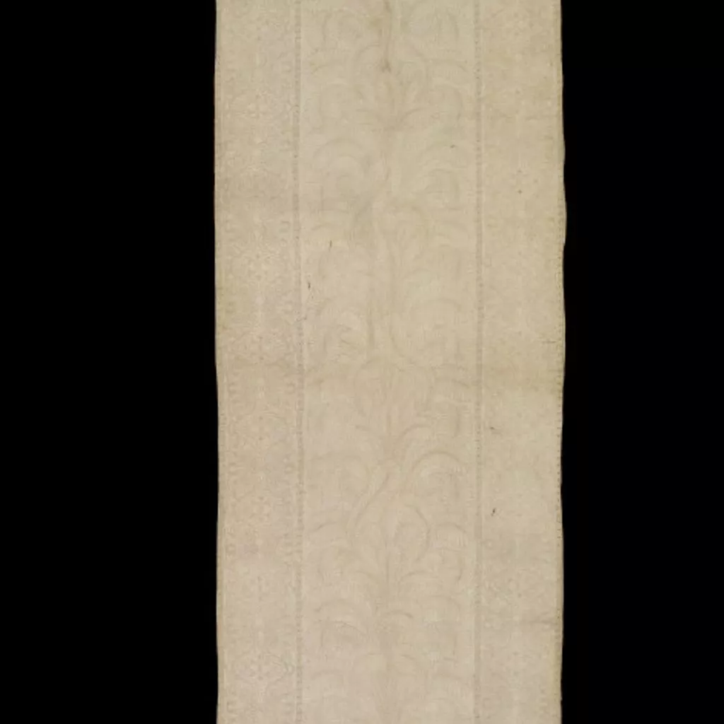 The curtain (A) is one of a pair and decorated with a vertical panel of feather motifs in the centre and with borders along the sides and lower edge of inter-laced feather and scroll motifs (as on the sides and foot of the cover).