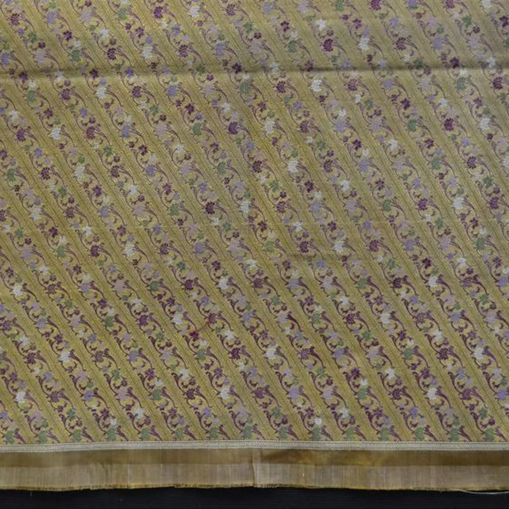 Fragment of brocaded satin, gold-coloured satin brocaded with diagonal bands of flowers in pinks, green and white on a ground of gold-wrapped thread. Textile, fragment, woven satin, brocaded with silk and gold-wrapped thread, Varanasi, ca. 1873