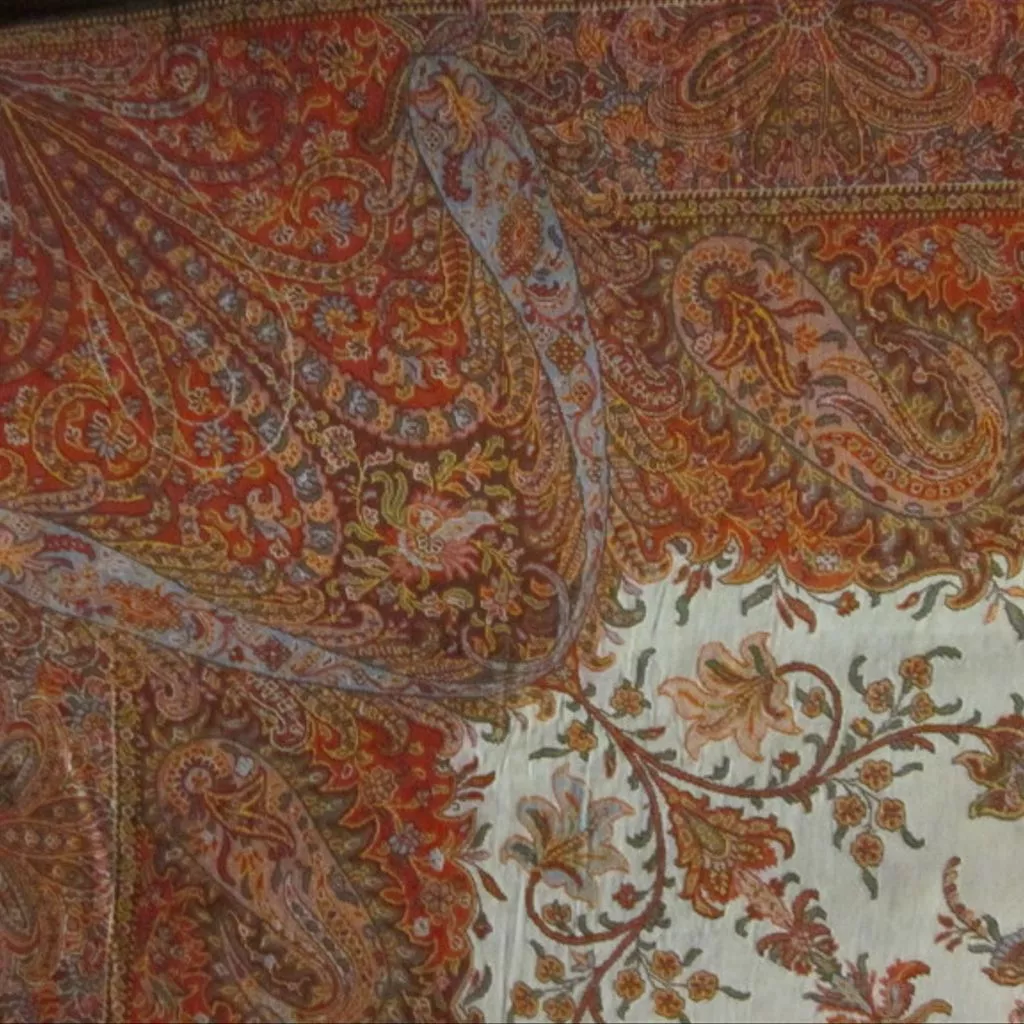Shawl of woven wool on a silk warp dyed red for the borders and brown, red and green for the narrow plain-woven end-pieces. It has a design of cones with surrounding small cone 'leaves' and fan shaped borders of tape-like cones with simple outline in white. There is a large central stylised flower-head, from which spring trails of bright flowers on a white ground. The rest of the field is filled with elaborate finials from corners and central side borders, linked by stems of flowers. The wide border is divided in two by one of the outer guard-strips. It is further overrun by large complexes of cones. The colours are in bright red, chocolate brown, bright green, bright light blue, golden yellow, pinkish lilac and white. Woven wool and silk shawl, Paisley, Scotland, ca. 1847.