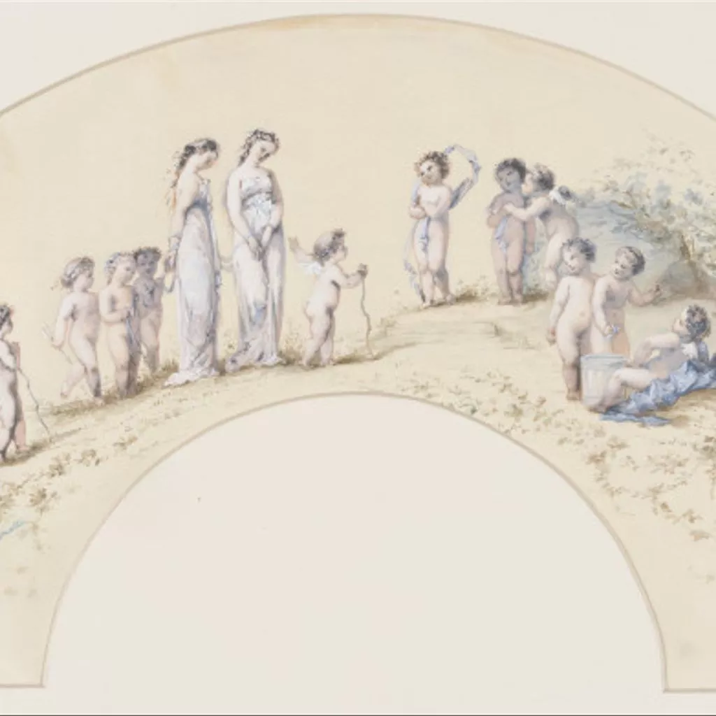 Watercolour on silk design for a fan entitled 'Love, Chief of Brigands', by Mme. Josephine Calamatta (nee Rochette), possibly after Dubouloz. French School, ca. mid 19th century. Watercolour on silk design for a fan entitled 'Love, Chief of Brigands'.