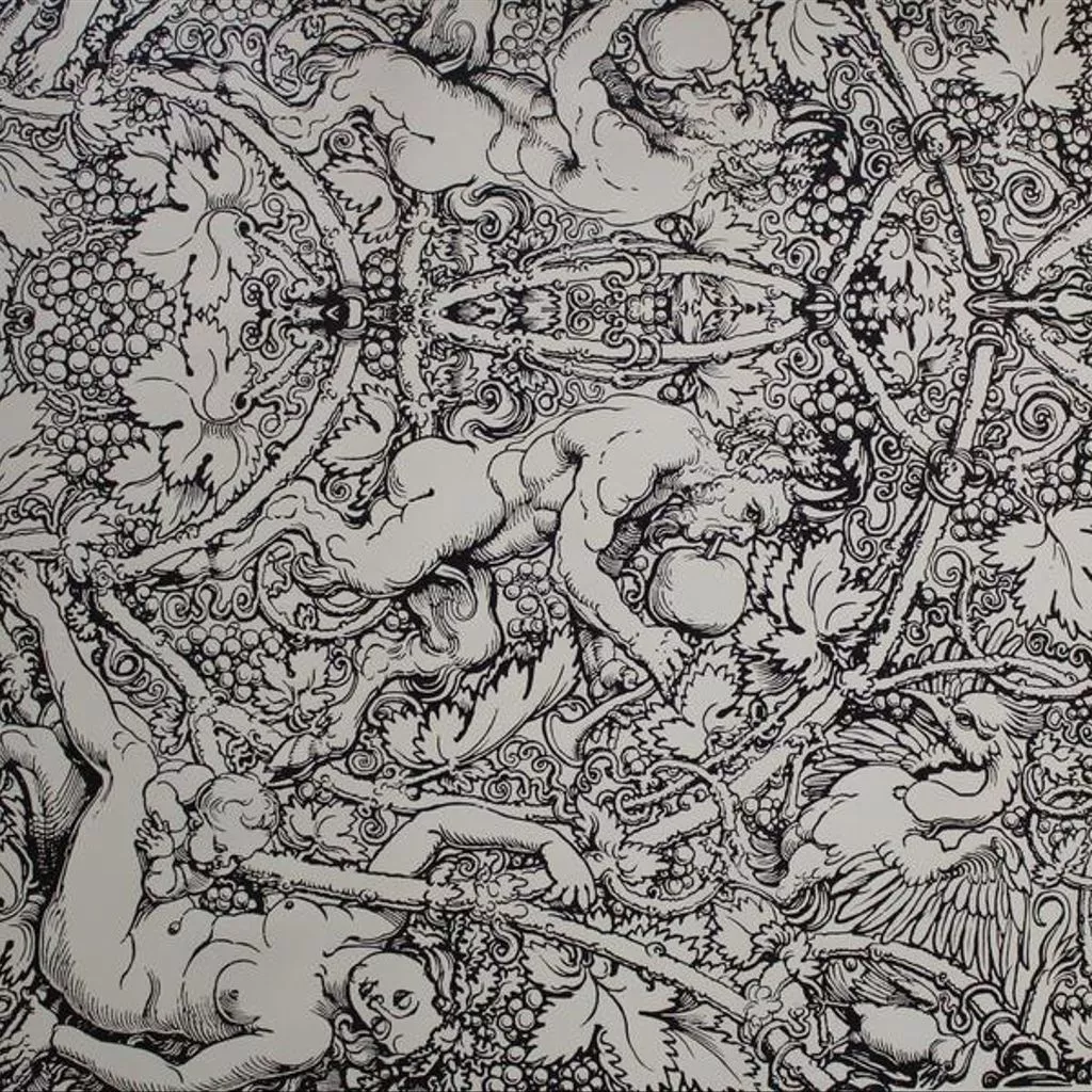 Reproduction of a woodcut wallpaper, reconstructed from fragments, showing a satyr playing a wind instrument, a nymph and a child among grape vines; with description etc in German in the margin; Probably designed by Celtis-Meister; Silk screen, black on cream, on paper; Published by Kurt Weber, Dreye bei Bremen; ca. 1530. Reproduction of a woodcut wallpaper, reconstructed from fragments, showing a satyr playing a wind instrument, a nymph and a child among grape vines; with description etc in German in the margin; Silk screen, black on cream, on paper.