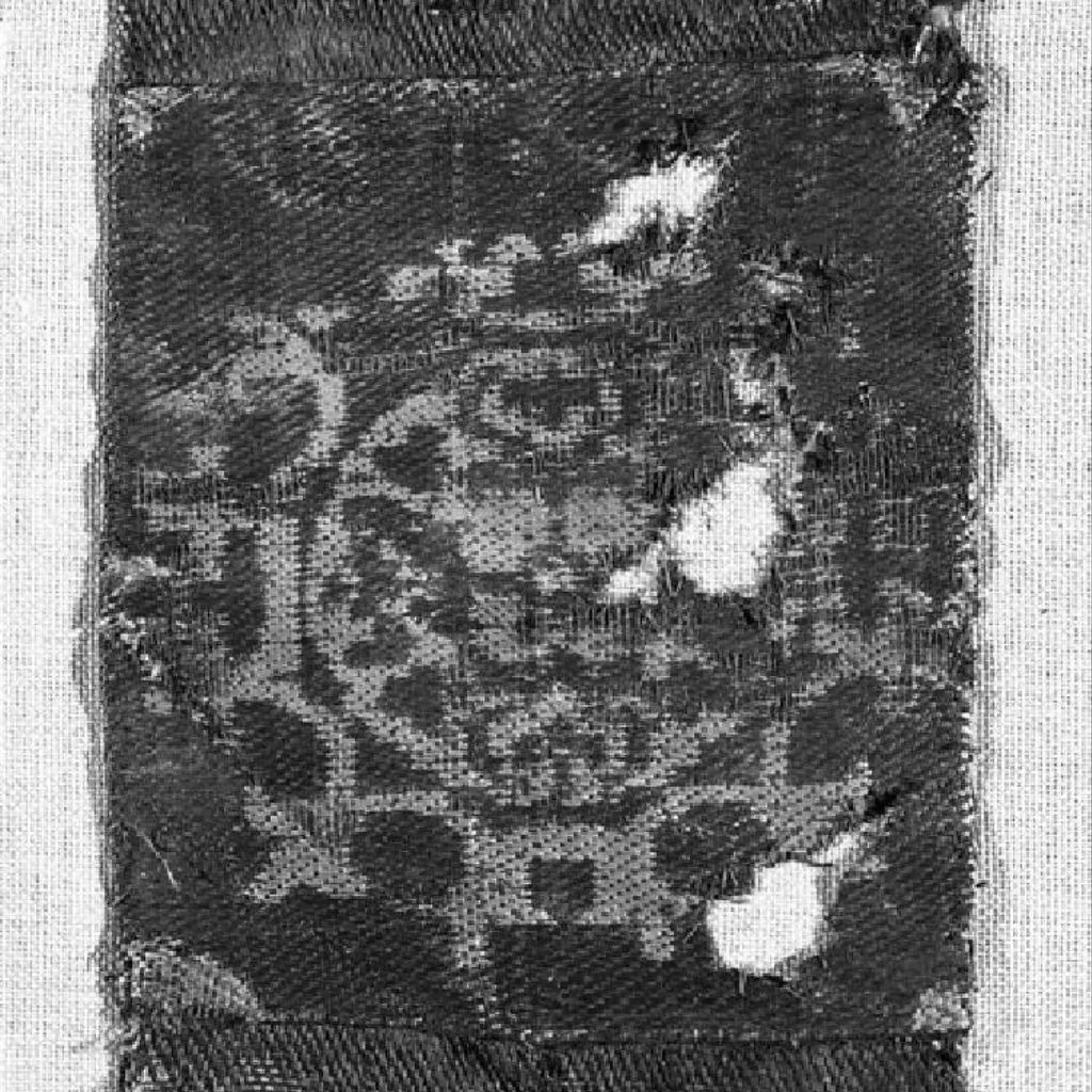 Dark grey ground; the design, of light brown, consists of roundels enclosing floral motifs with broders of festooned branches carrying flowers; the design in the fragment shows one complete roundel and parts of two others; the middle part is sewn onto the fragment.