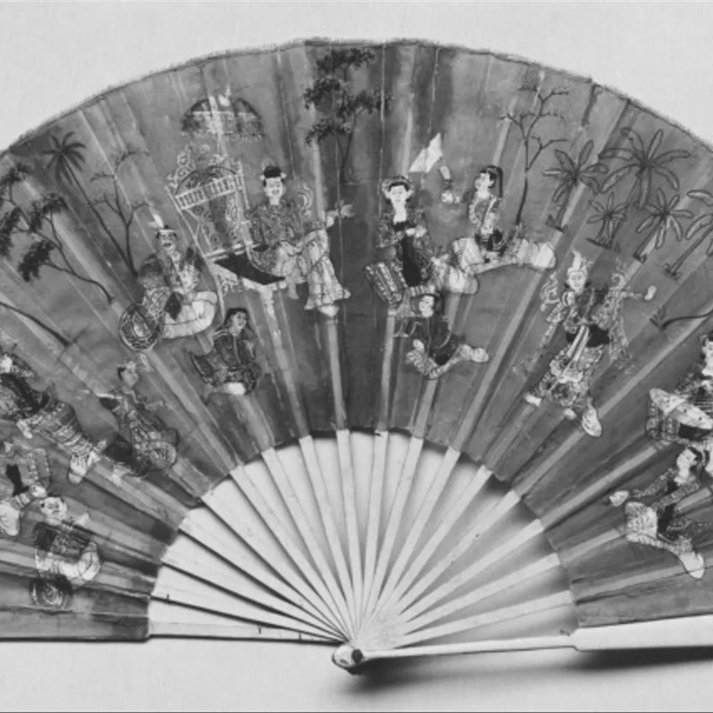 The fan depicts the last King of Burma, Thibaw Min, with his principal consort, Queen Supayalat, attended by courtiers and ladies, dressed in the court costumes of the period, witnessing an outdoor play (known as a zat-pwe) performed by actors and musicians in the Royal Gardens of the Palace at Mandalay.