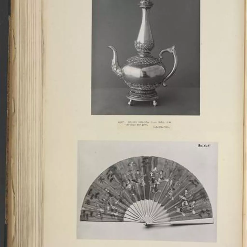 This fan of silk gauze on wooden sticks and guards, painted in tempera colours and gold and silver, is probably the work of a court painter attached to the royal palace in Mandalay, where the fan is said to have been found in 1885, after the annexation of Upper Burma and the exile of the last king of Burma, King Thibaw.